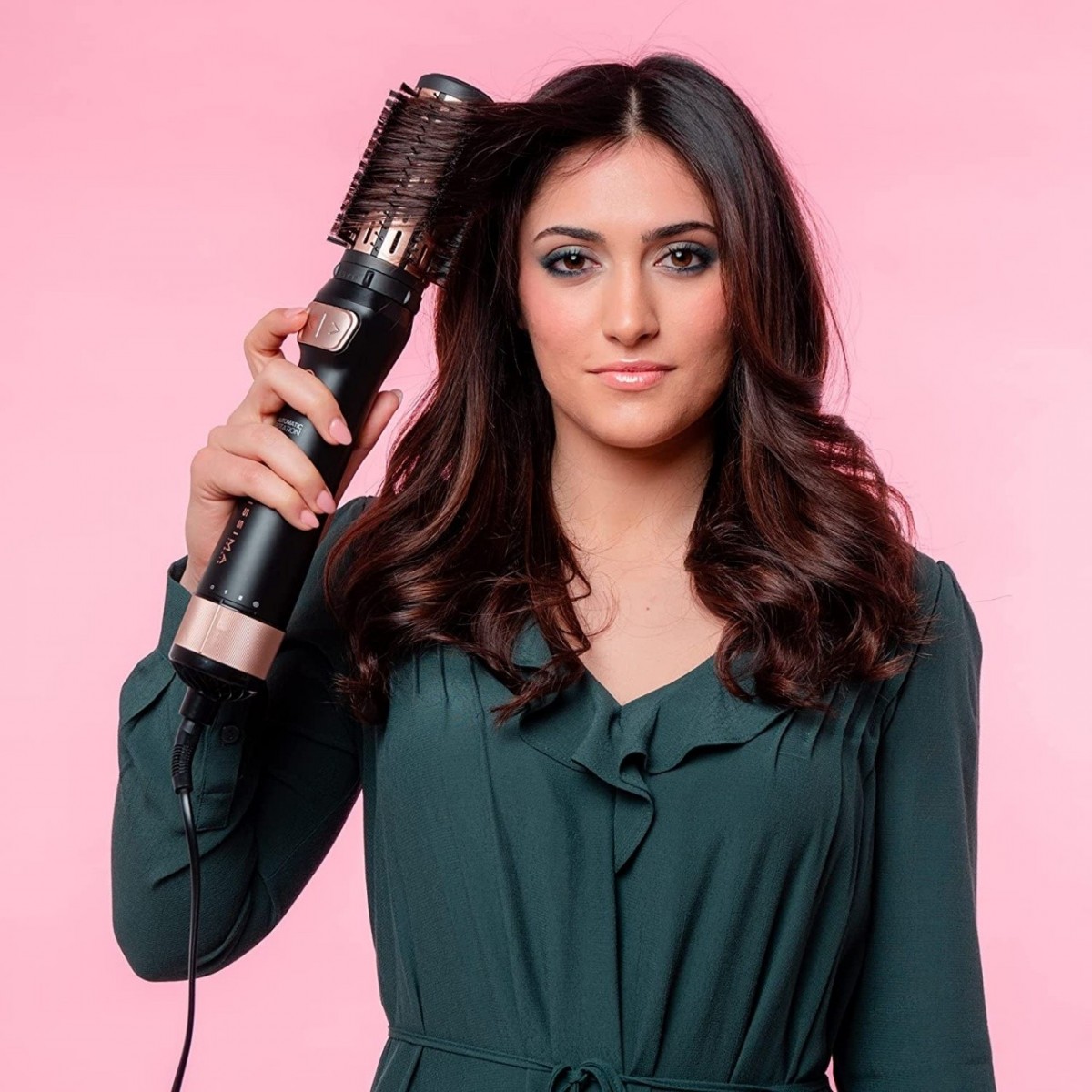 Modella e asciuga i capelli in unico e semplice gesto grazie alla rotazione automatica della spazzola e al getto d’aria calda.