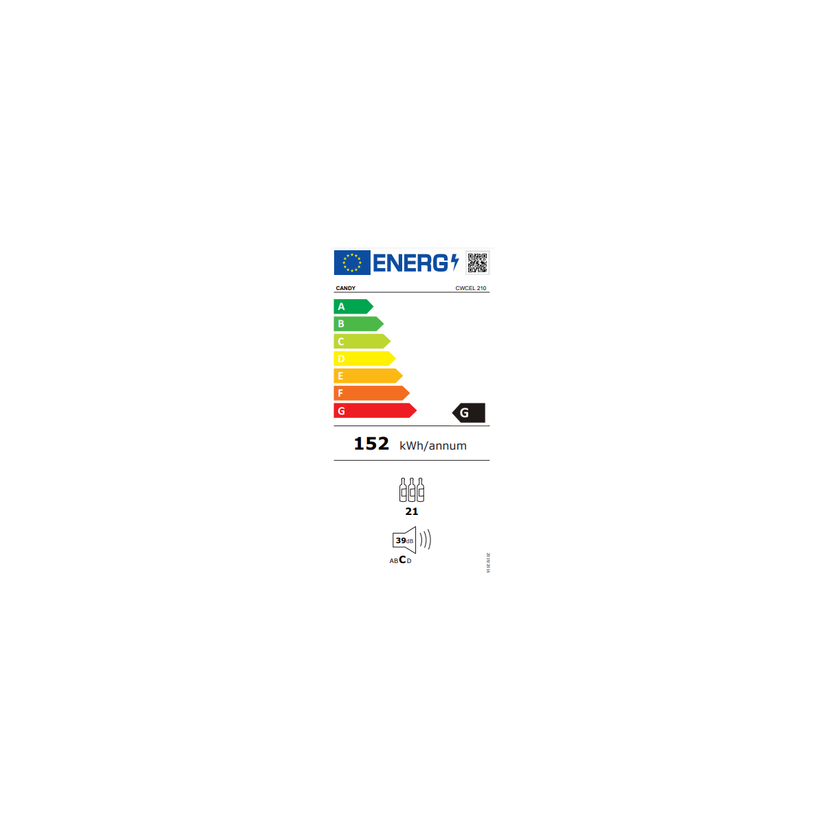 Candy DiVino CWCEL 210. Posizionamento dell'apparecchio: Libera installazione, Colore struttura: Nero, Colore interno: Nero. Capacità bottiglie: 21 bottiglia/bottiglie, Tipo di prodotto: Cantinetta vino con compressore, Intervallo temperatura (zona 1): 7 - 18 °C. Classe efficienza energetica: G, Consumo energetico annuo: 152 kWh, Scala di efficienza energetica: Da A a G. Tipo di controllo: Pulsanti, Tipo di display: LED, Posizionamento del display: Interno. Larghezza: 400 mm, Profondità: 550 mm, Altezza: 700 mm