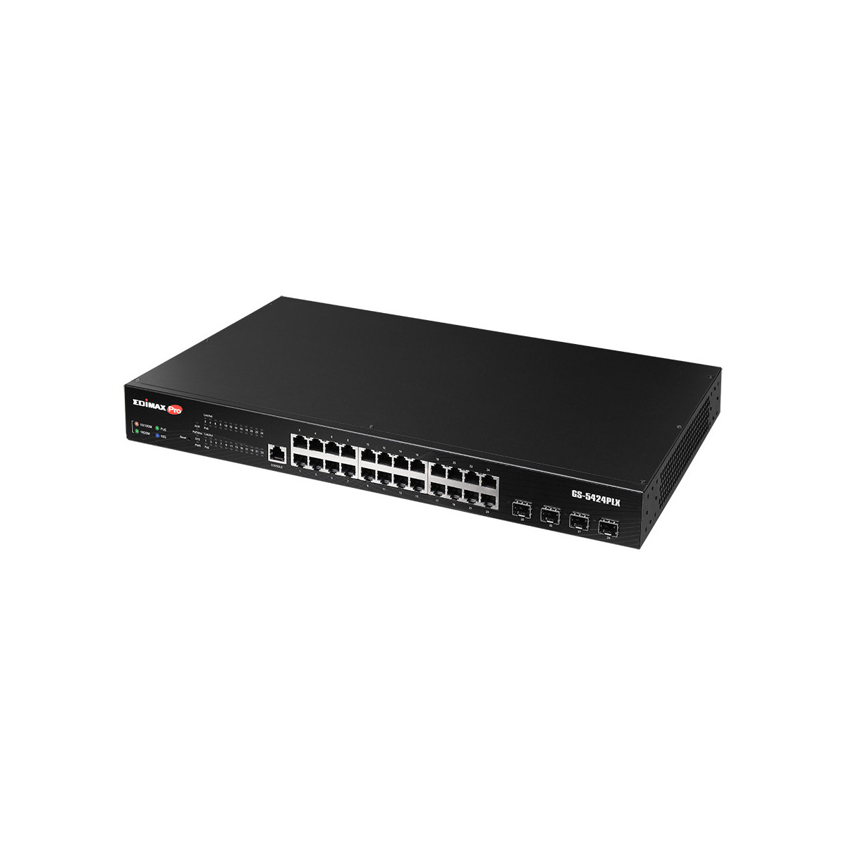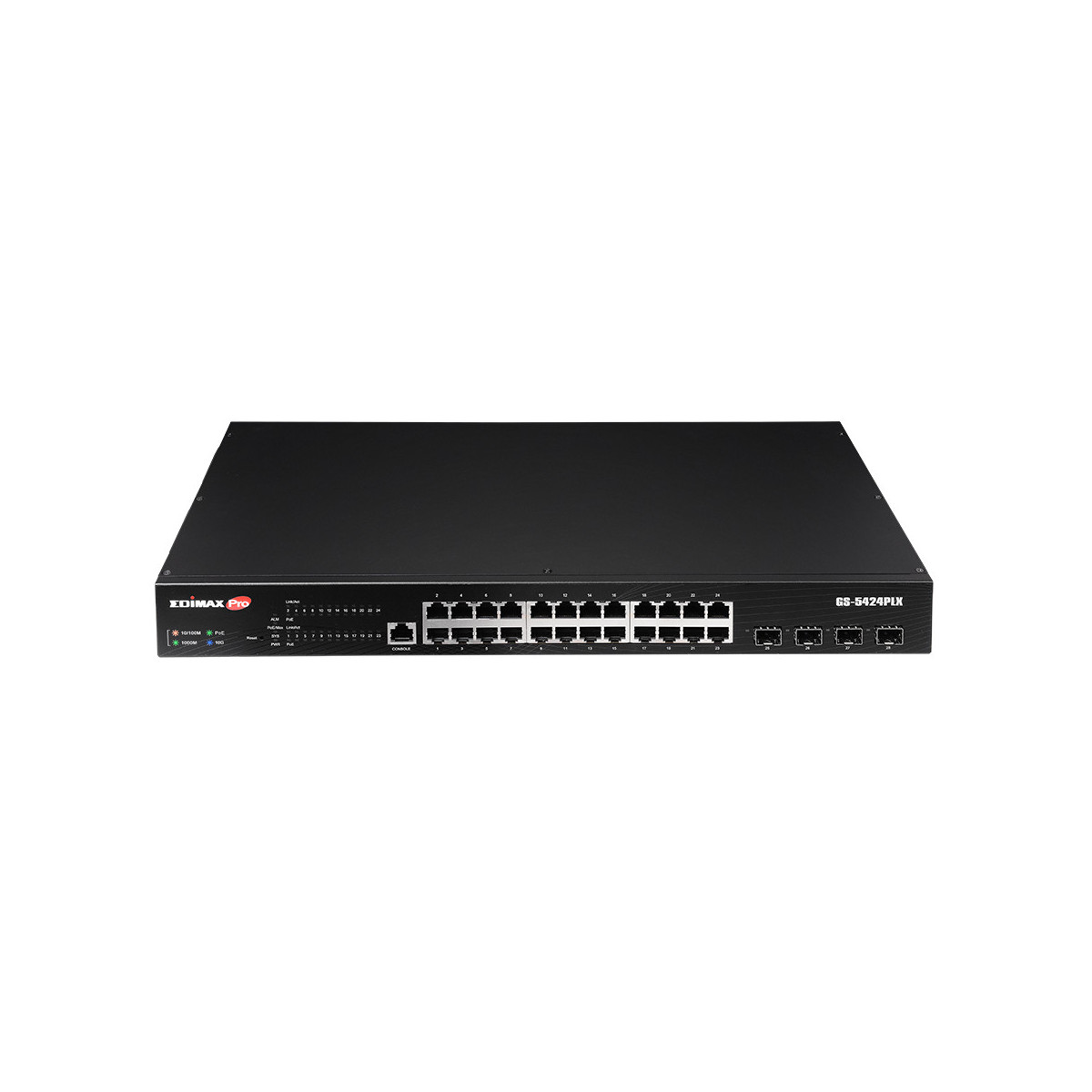 Edimax GS-5424PLX. Tipo interruttore: Gestito, Livello del commutatore: L2. Tipo di porte RJ-45: Gigabit Ethernet (10/100/1000), Quantità di porte RJ-45: 24, Quantità di moduli SFP+ installati: 4, Console port: RJ-45. Dimensioni tavola MAC: 16000 voci, Capacità di commutazione: 128 Gbit/s. Standard di rete: IEEE 802.1D,IEEE 802.1Q,IEEE 802.1p,IEEE 802.1w,IEEE 802.1x,IEEE 802.3,IEEE 802.3ab,IEEE.... Connettore di alimentazione: Jack di ingresso AC. Supporto Power over Ethernet (PoE). Montaggio rack, Fattore di forma: 1U