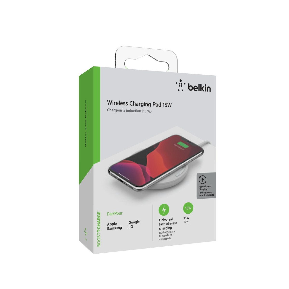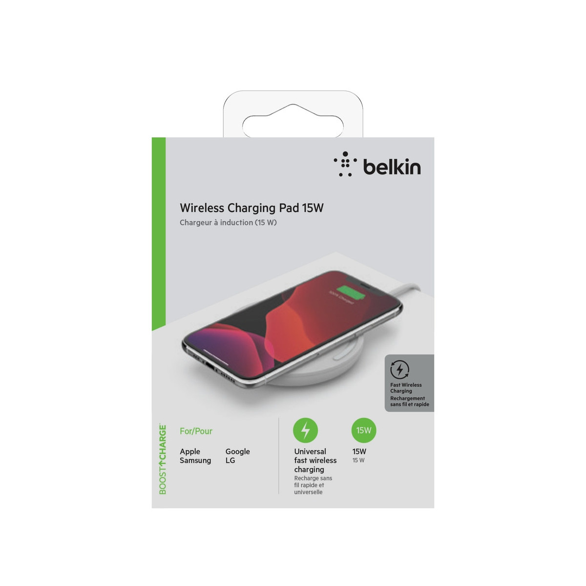 Belkin Boost Charge. Tipo di caricatore: Interno, Tipologia alimentazione: AC, USB, Compatibilità caricatore: Smartphone, Carica wireless, Ricarica rapida. Colore del prodotto: Bianco