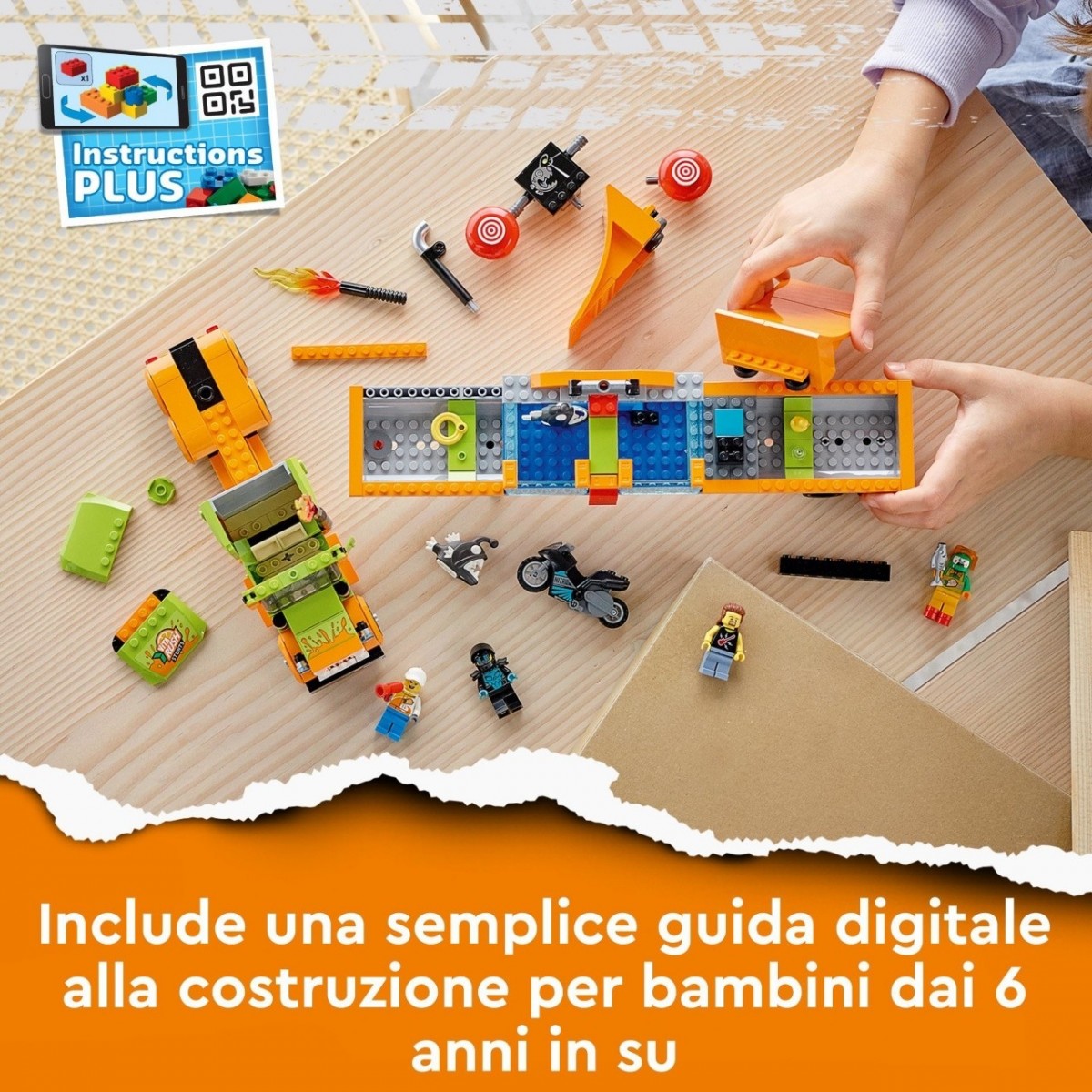 - Allestisci la scena per un gioco pieno di azione con il playset Truck dello Stunt Show LEGO® City (60294) di qualità premium, che include una moto acrobatica con funzione “carica e vai” e ostacoli e sfide per acrobazie spettacolari.