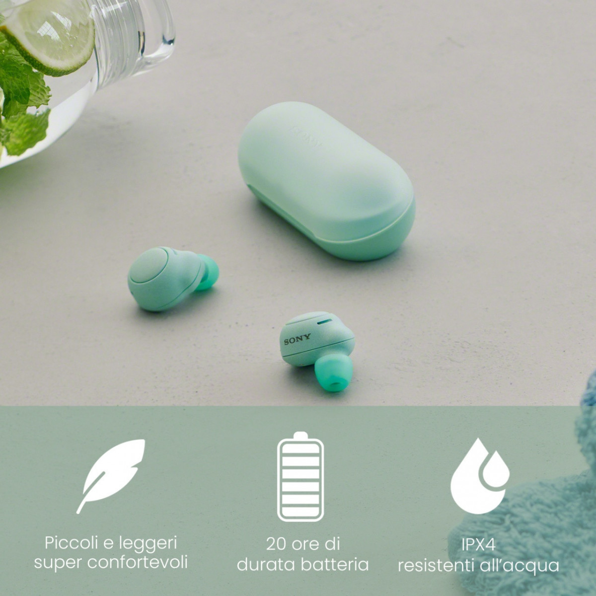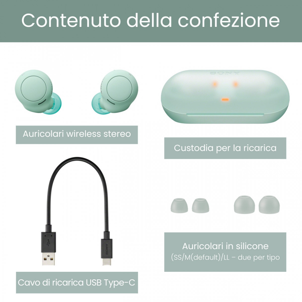 Sony Auricolari WF-C500 True Wireless - Fino a 20 ore di durata della batteria con custodia di ricarica - Compatibile con l'Assistente Vocale - Microfono integrato per le telefonate - Connessione Bluetooth affidabile - Verde. Tipo di prodotto: Auricolare, Stile d'uso: In-ear, Utilizzo raccomandato: Musica e Chiamate. Tecnologia di connessione: Wireless, Profili Bluetooth: A2DP, Banda di frequenza: 2.4 GHz. Disegno auricolare: Intraurale, Sistema acustico: Chiuso, Frequenza cuffia: 20 - 20000 Hz. Tipo di microfono: Integrata. Tipo batteria: Batteria integrata, Tecnologia batteria: Ioni di Litio, Durata batteria: 5 h