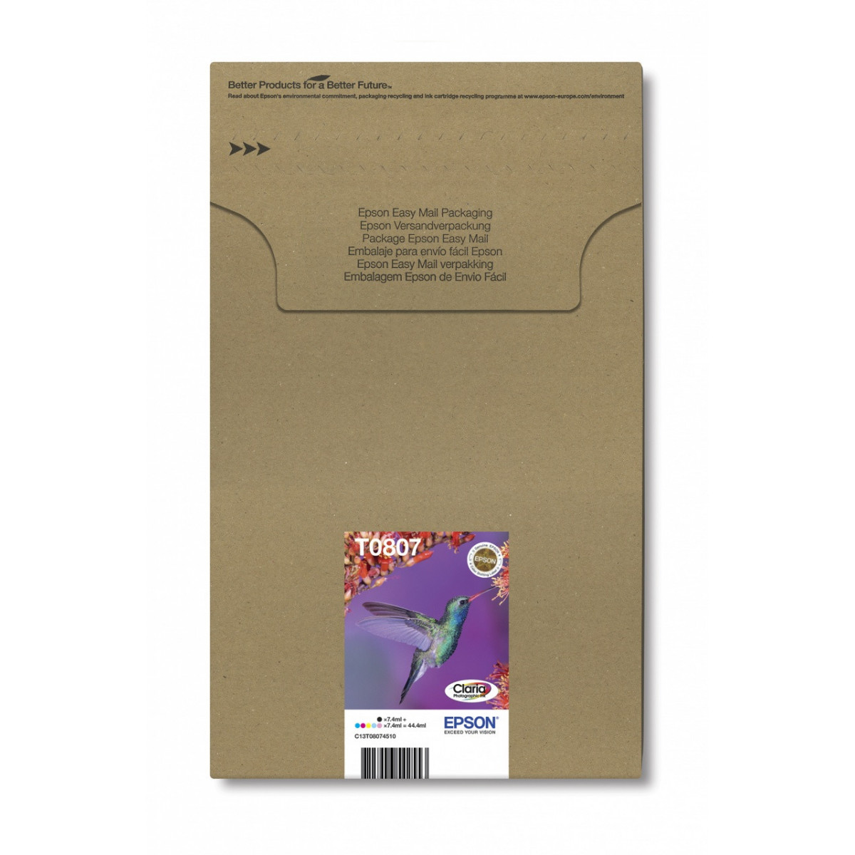 Epson Hummingbird Multipack 6 colori T0807 Claria Photographic Ink in confezione EasyMail Packaging. Tipo: Originale, Tipo di inchiostro: Inchiostro a base di pigmento, Colori di stampa: Nero, Ciano, Ciano chiaro, Magenta chiaro, Magenta, Giallo. Larghezza imballo: 20 mm, Profondità imballo: 320 mm, Altezza imballo: 195 mm. Ampiezza del pallet: 80 cm, Lunghezza del pallet: 120 cm, Altezza del pallet: 22,2 cm