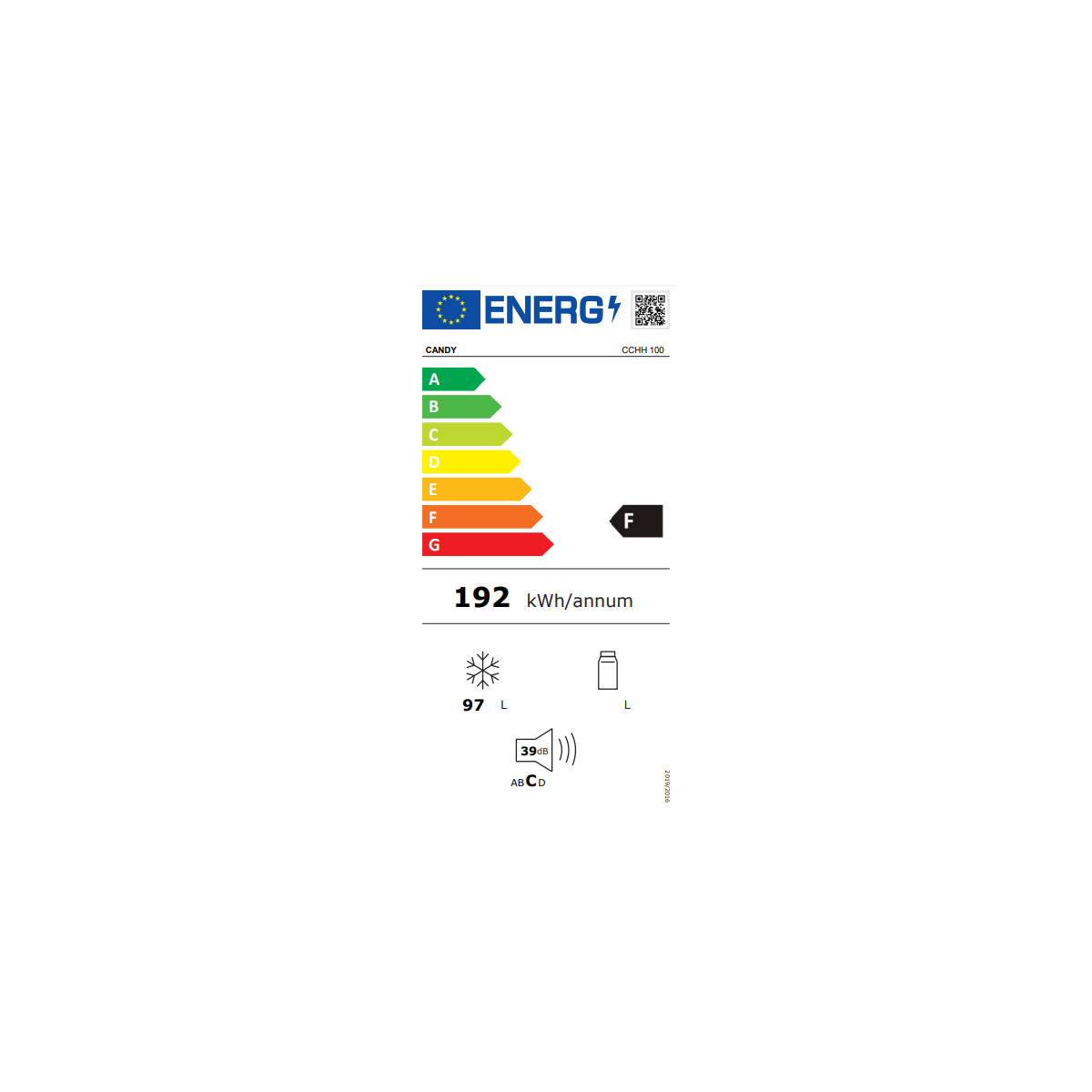 Candy CCHH 100. Tipo di prodotto: Congelatore a pozzo, Posizionamento dell'apparecchio: Libera installazione, Colore del prodotto: Bianco. Capacità netta totale: 97 L, Classe emissione rumore: C, Emissione acustica: 39 dB. Capacità netta congelatore: 97 L, Capacità di congelamento: 9 kg/24h, Autonomia senza energia elettrica: 11 h. Indicatori LED: Allarme, Potenza. Classe efficienza energetica: F, Consumo energetico annuo: 192 kWh, Scala di efficienza energetica: Da A a G
