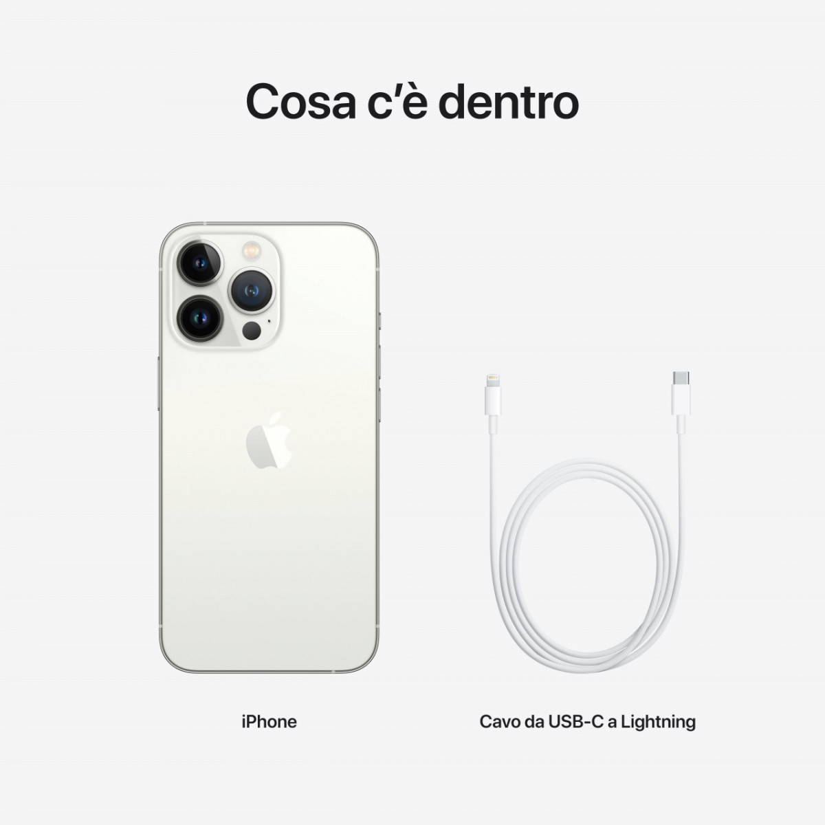 Apple iPhone 13 Pro 512GB Argento. Dimensioni schermo: 15,5 cm (6.1"), Risoluzione del display: 2532 x 1170 Pixel, Tipo di display: OLED. Famiglia processore: Apple, Modello del processore: A15. Capacità memoria interna: 512 GB. Risoluzione fotocamera posteriore (numerico): 12 MP, Tipo di fotocamera posteriore: Tripla fotocamera. Capacità della scheda SIM: Doppia SIM. Sistema operativo incluso: iOS 15. Colore del prodotto: Argento. Peso: 204 g