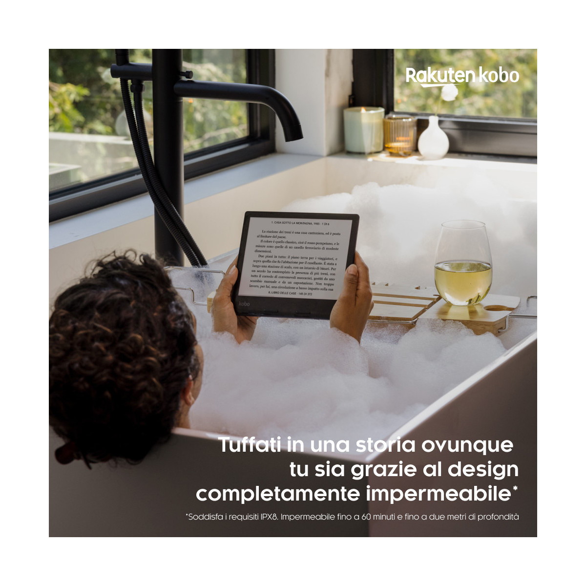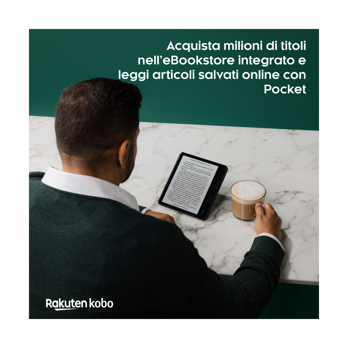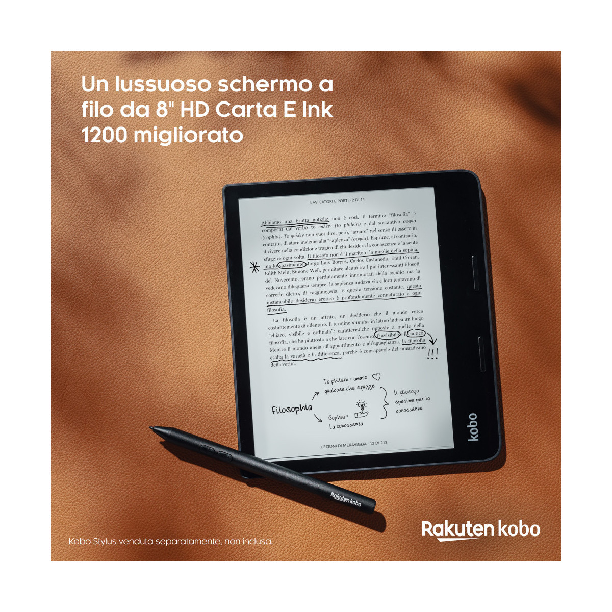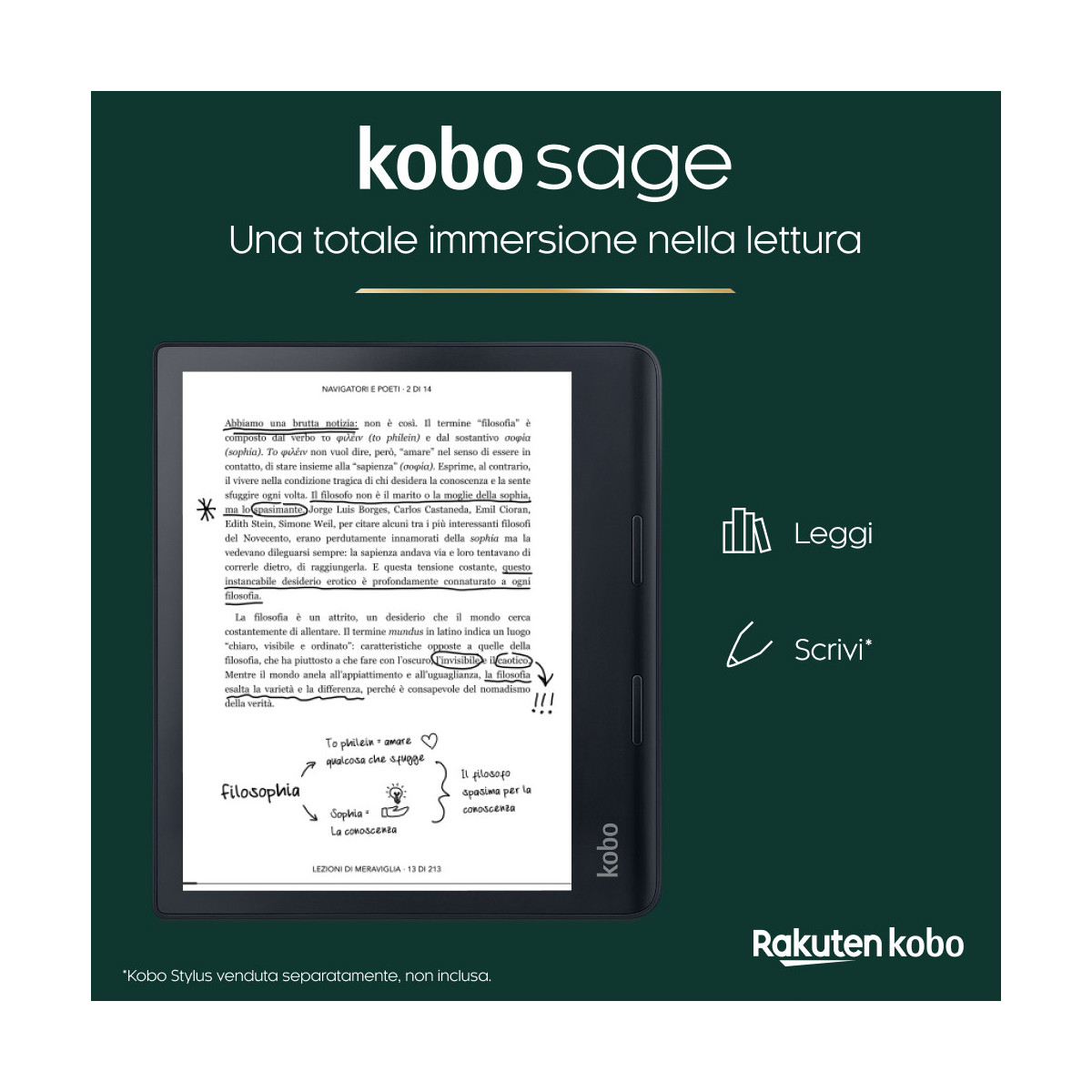 Ecco Kobo Sage, il nostro eReader più completo di sempre. Creato per rendere ancora più piacevole il momento della lettura, Kobo Sage offre tutte le funzioni Kobo in una veste elegante. Il lussuoso touchscreen a filo da 8" HD E Ink Carta 1200 offre prestazioni superiori e profondità di contrasto, senza alcun riflesso. Ottieni il massimo dalla tua esperienza con Kobo Sage grazie ai suoi raffinati accessori dal design personalizzato. La SleepCover* e la nuova PowerCover* di Kobo Sage sono state progettate appositamente per garantire protezione e un’esperienza premium. E, grazie alla compatibilità con Kobo Stylus*, puoi immergerti ancora di più nella tua lettura preferita prendendo appunti e salvandoli su altri dispositivi tramite il supporto Dropbox. Goditi la tranquillità che deriva dall'avere ogni funzione a portata di mano e sapere di avere la migliore e più coinvolgente esperienza di lettura!