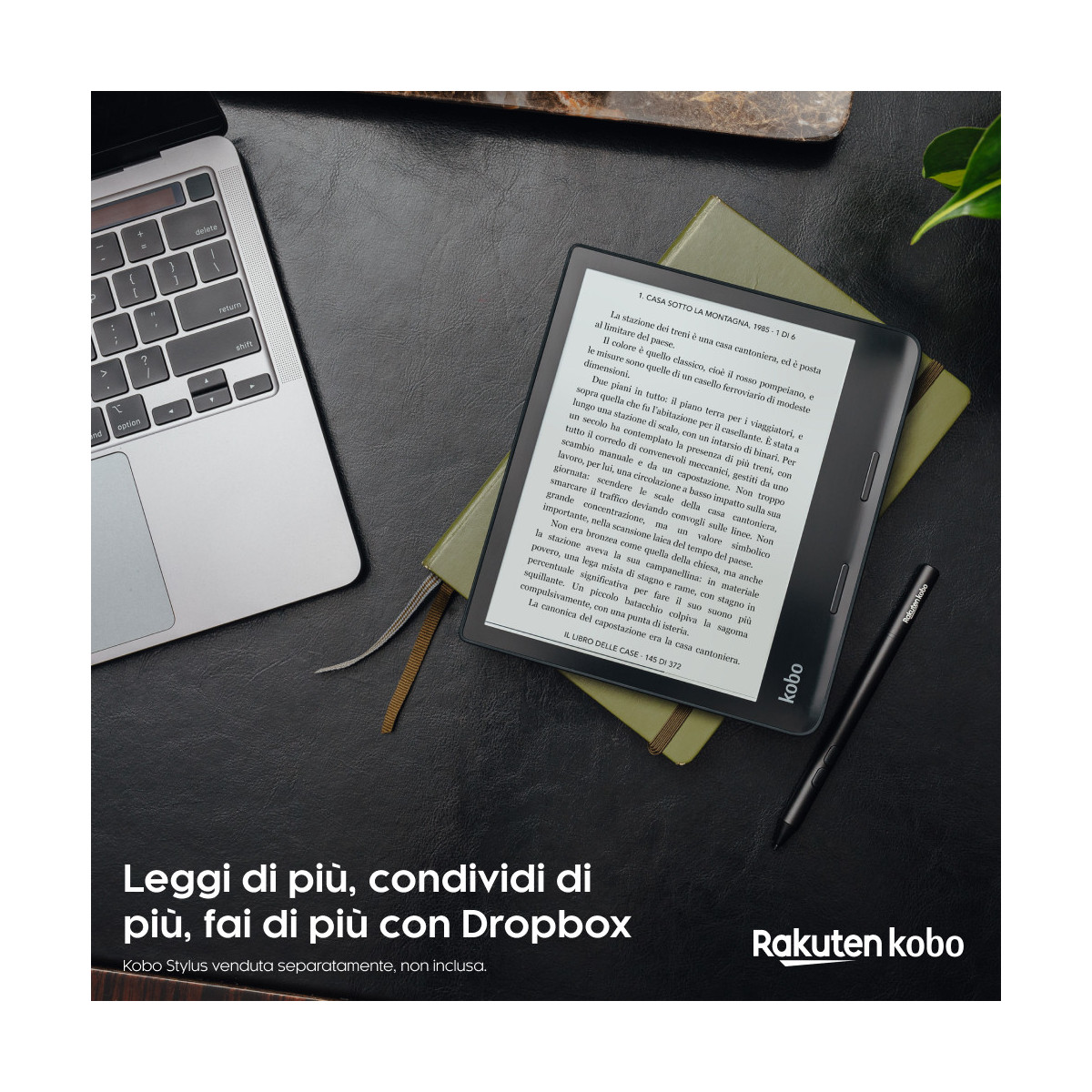 Condividi ogni cosa tramite il supporto Dropbox. Aggiungi eBook e documenti in modalità wireless, esporta gli appunti creati con Kobo Stylus** e tieni tutto a portata di mano grazie allo spazio di archiviazione cloud.
