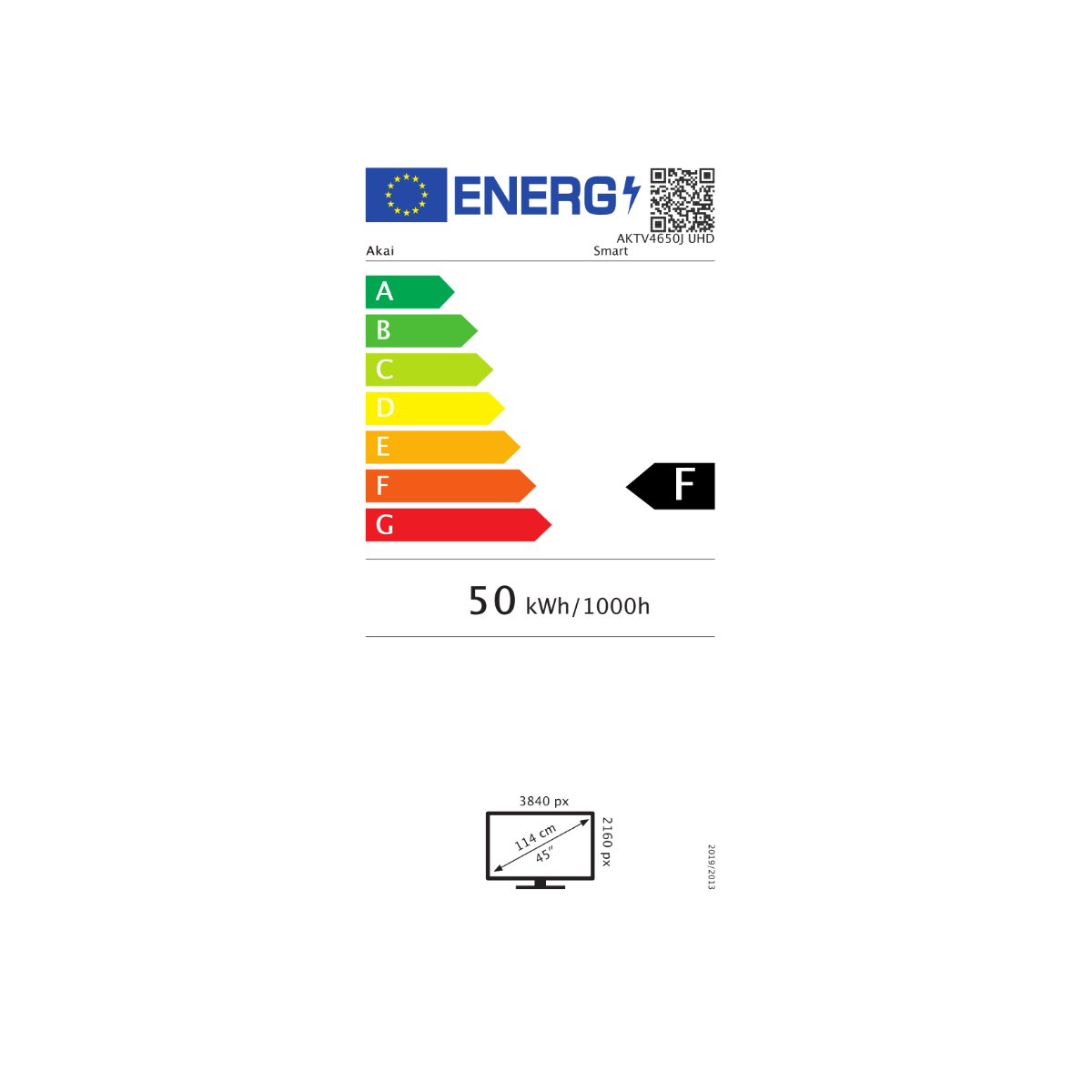 Akai AKTV4650J. Dimensioni schermo: 114,3 cm (45"), Risoluzione del display: 3840 x 2160 Pixel, Tipologia HD: 4K Ultra HD, Tecnologia display: LED, Forma dello schermo: Piatto. Smart TV. Luminosità schermo: 250 cd/m², Tempo di risposta: 9,5 ms, Rapporto di contrasto: 100000:1, Rapporto d'aspetto nativo: 16:9. Formato del segnale digitale: DVB-S2,DVB-T,DVB-T2. Wi-Fi, Collegamento ethernet LAN. Colore del prodotto: Nero