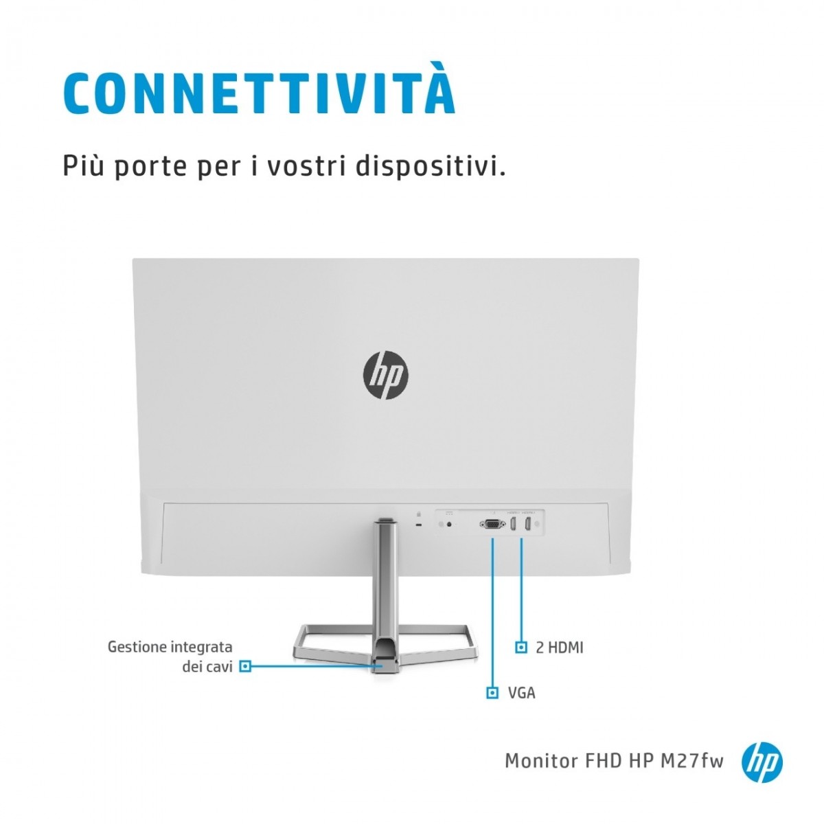 HP M27fw. Dimensioni schermo: 68,6 cm (27"), Risoluzione del display: 1920 x 1080 Pixel, Tipologia HD: Full HD, Tecnologia display: LED, Tempo di risposta: 5 ms, Rapporto d'aspetto nativo: 16:9, Angolo di visualizzazione (orizzontale): 178°, Angolo di visualizzazione (verticale): 178°. Colore del prodotto: Argento