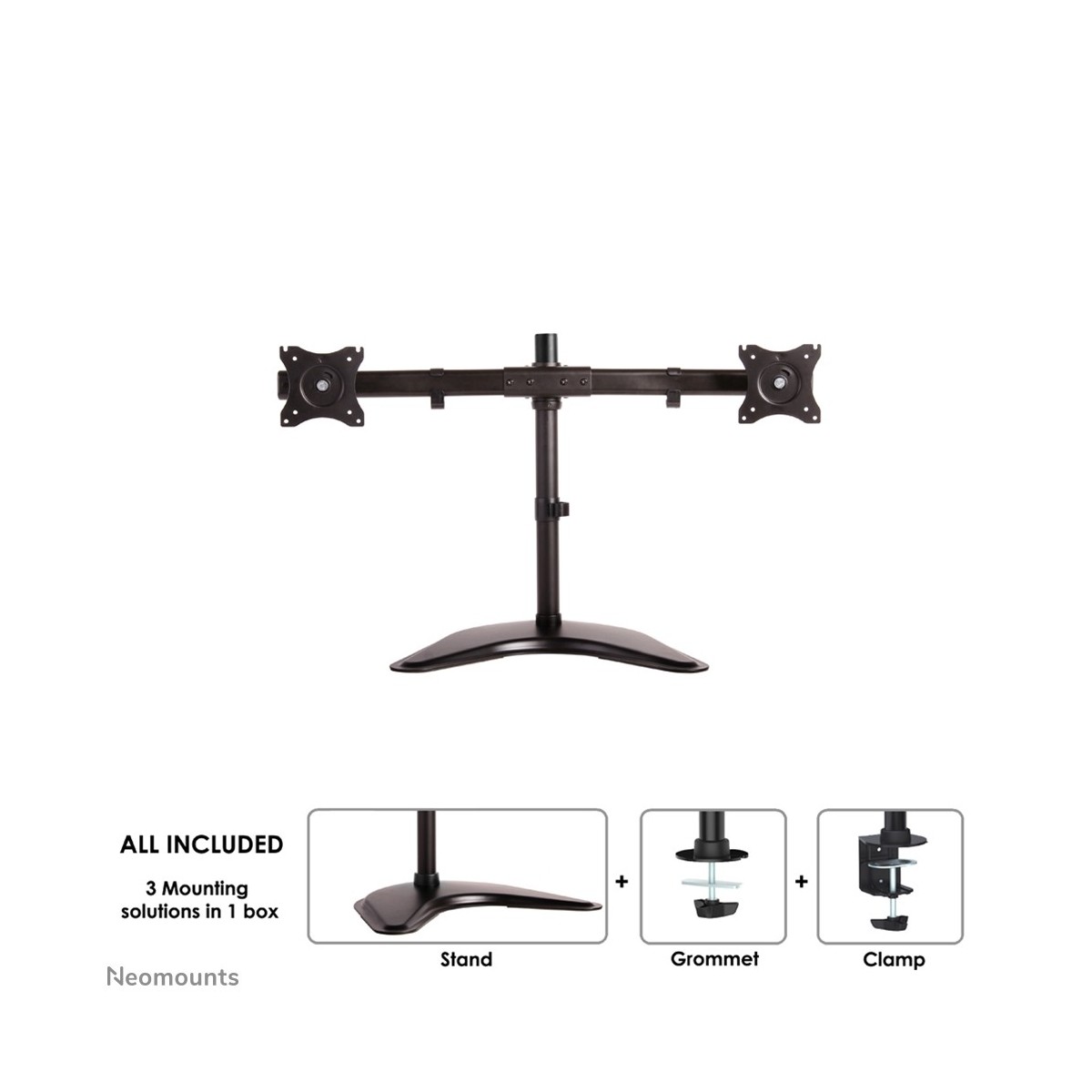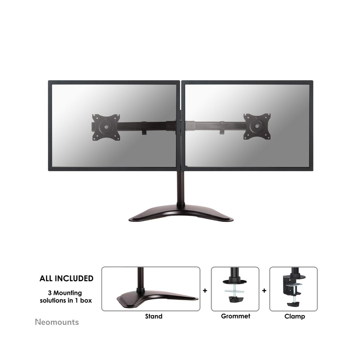 Questo braccio porta monitor Neomounts Select, modello NM-D335DBLACK consente di collegare due schermi LCD/LED/TFT su di una scrivania con la modalità di fissaggio su piano attraverso vite centrale, piedi o morsetto.