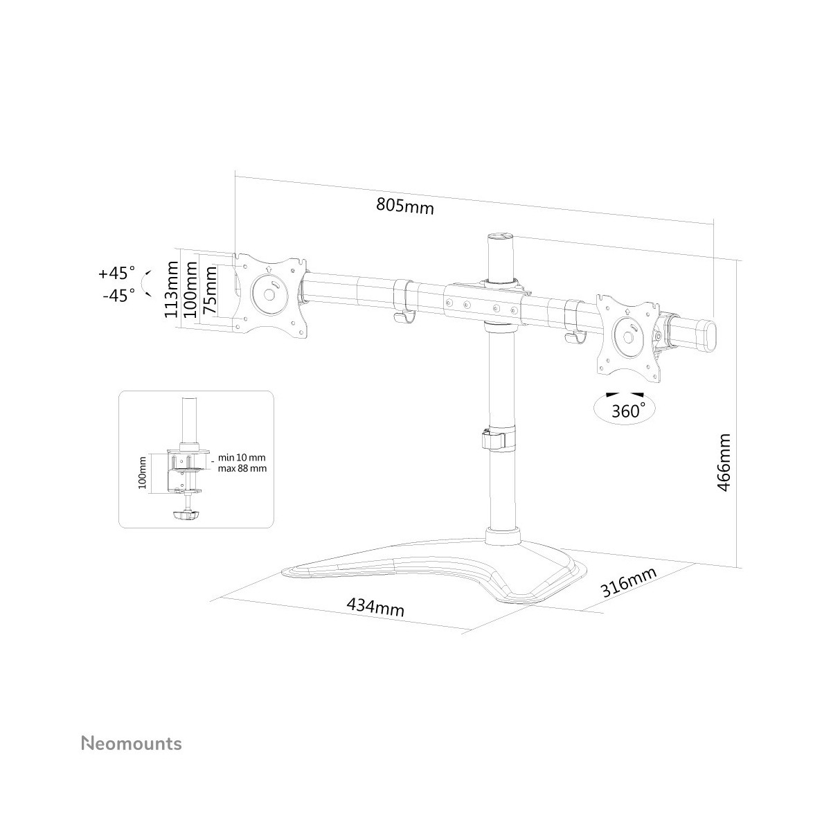 Il supporto NM-D335DBLACK ha 1 punto di articolazione ed è adatto a schermi fino a 27" (69 cm) con una capacità massima di trasporto di 8 kg per ogni schermo. Questo prodotto è adatto per schermi con fori VESA modello 75x75 o 100x100 mm. Per una diversa (più grande) foratura, si può combinare con una delle nostre piastre di adattamento VESA.