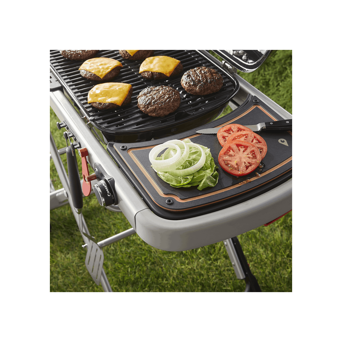 Prepara un pasto e servi i tuoi ospiti mentre cucini in viaggio con il barbecue Weber Traveler. Il supporto Prep & Serve aderisce perfettamente al ripiano laterale presente sul barbecue Weber Traveler, fornendo uno spazio sicuro e resistente per preparare e servire il cibo. Il tagliere reversibile è dotato di una superficie resistente progettata per tagliare, sminuzzare e affettare, e dispone di impugnature antiscivolo per evitare che scivoli durante l'uso. È perfetto per affettare qualsiasi cosa, dal pollo alle bistecche, e comprende ampie scanalature per raccogliere i succhi in eccesso.