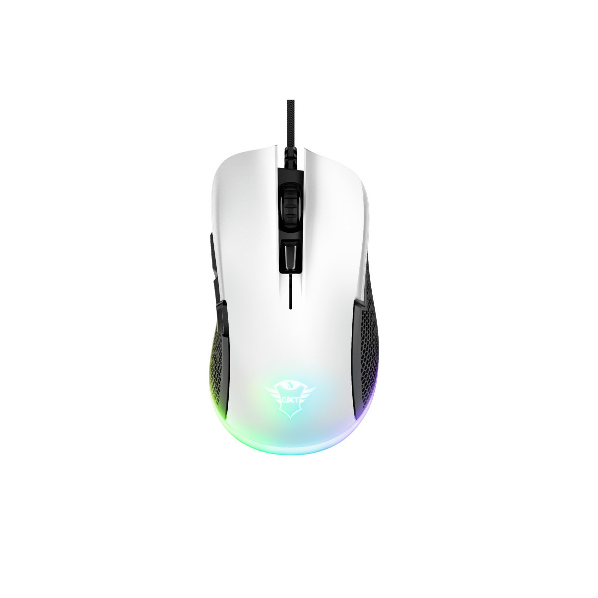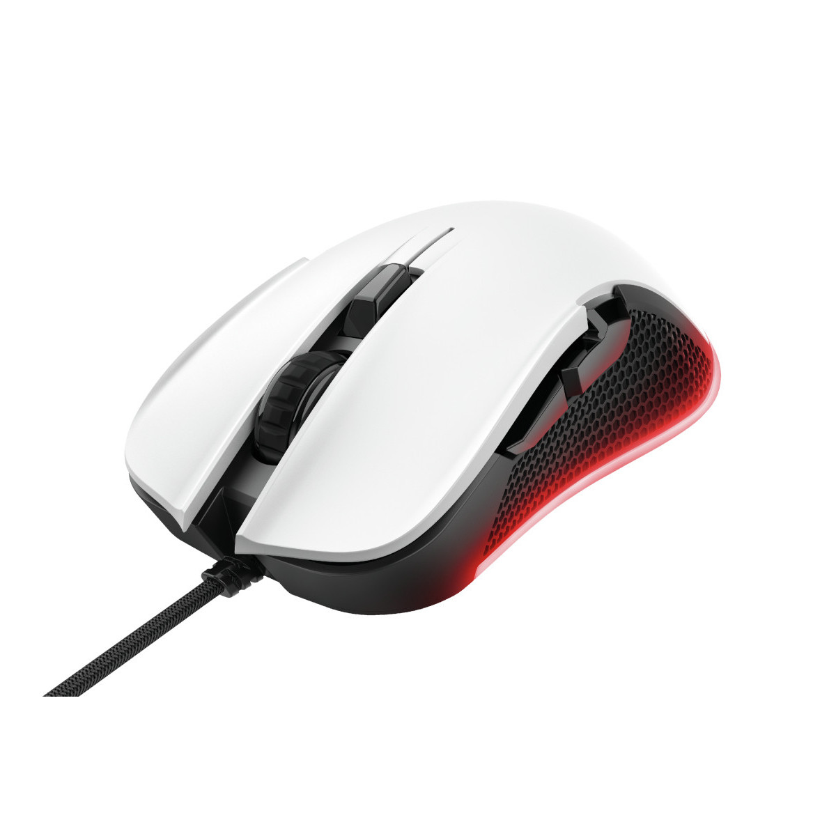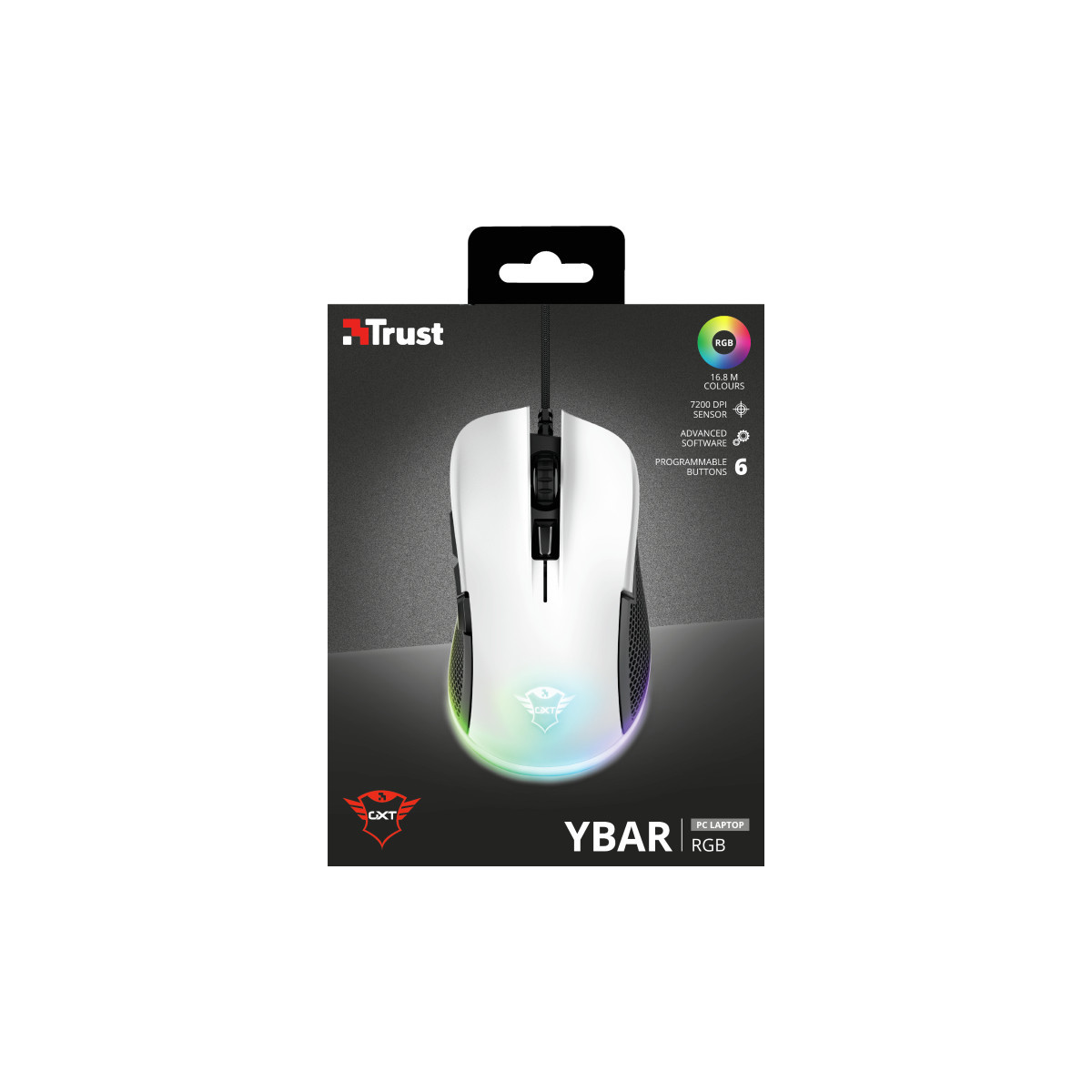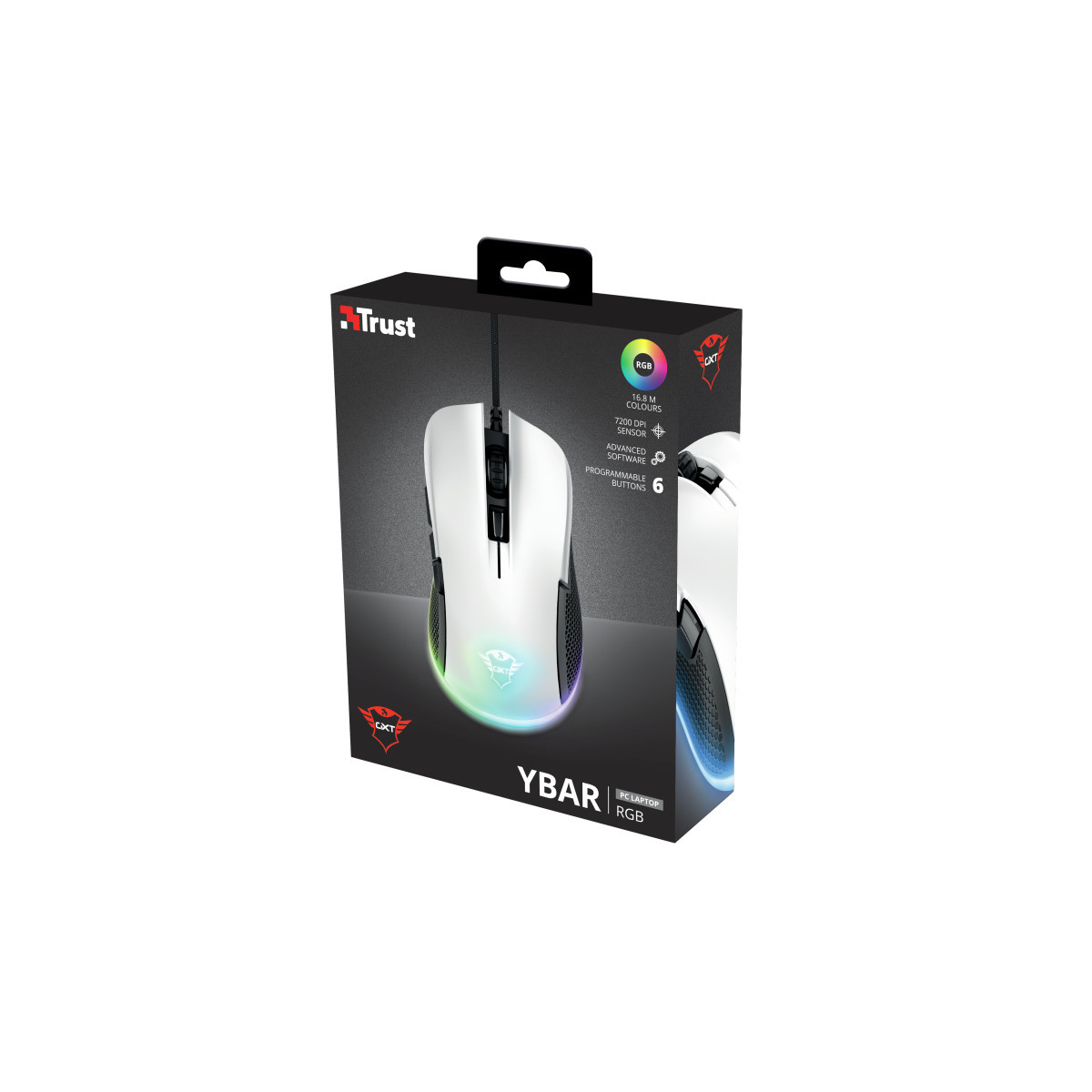 Trust GXT 922W YBAR. Fattore di forma: Mano destra. Tecnologia di rilevamento del movimento: Ottico, Interfaccia dispositivo: USB tipo A, Risoluzione movimento: 7200 DPI, Tipo di pulsanti: Tasti premuti, Numero di tasti: 6, Tipo di scorimmento: Rotella, Accelerazione (max): 20 G. colore d'illuminazione: Multi. Alimentazione: Cavo. Colore del prodotto: Nero, Bianco