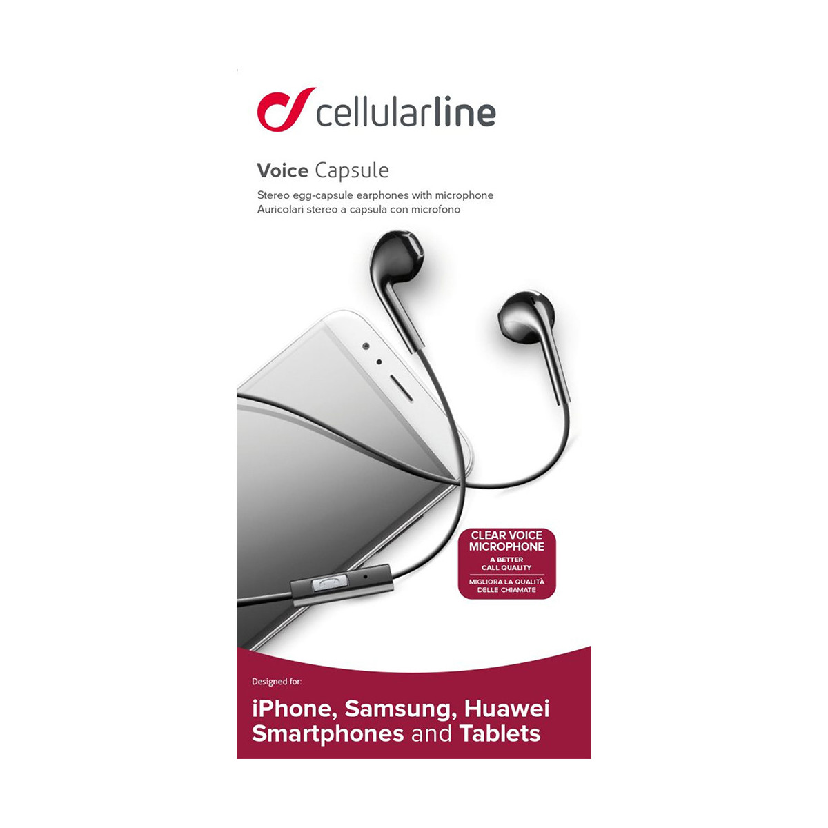 Cellularline Voice Capsule. Tipo di prodotto: Auricolare, Stile d'uso: In-ear, Colore del prodotto: Nero. Tecnologia di connessione: Cablato. Disegno auricolare: Intraurale. Tipo di microfono: In linea. Tipo di imballo: Scatola