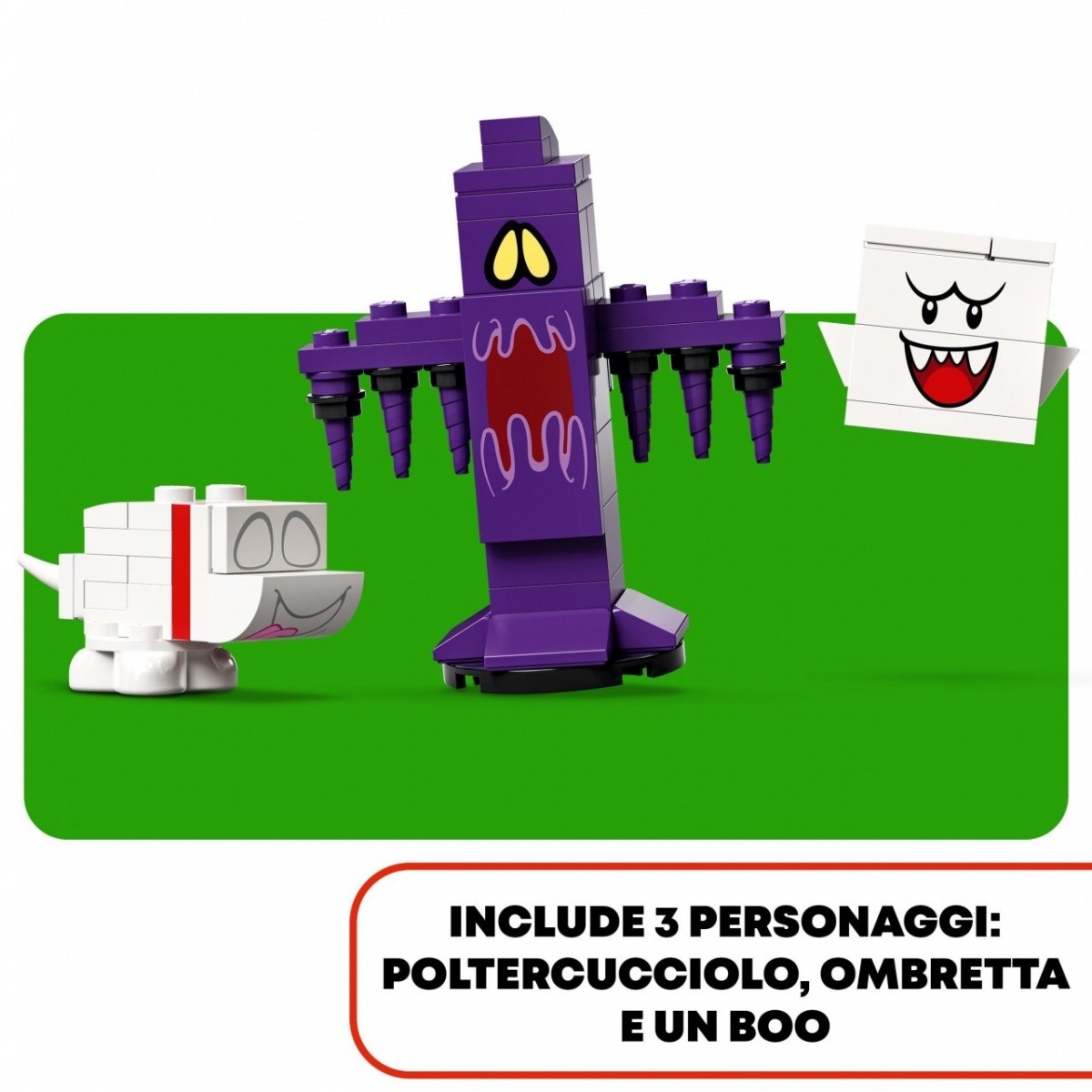 Esplora un cimitero, sconfiggi i nemici e vivi tante altre avventure con l'Atrio di Luigi’s Mansion - Pack di Espansione (71399), il giocattolo creativo LEGO Super Mario per bambini dai 7 anni in su. Il cimitero contiene una start plate, un cancello, una palla ombra per abbattere Ombretta e una funzione di apertura della porta della villa, tutte novità LEGO disponibili da gennaio 2022. All'interno dell'ingresso della villa, c'è una piattaforma rotante e un Osso d'Oro digitale da raccogliere per un simpatico Poltercucciolo. Il set contiene 3 personaggi LEGO: Poltercucciolo, Ombretta e un Boo. (Nota: I personaggi LEGO Luigi o LEGO Mario non sono inclusi. Gli Starter Pack 71387 o 71360 sono necessari per il gioco interattivo).