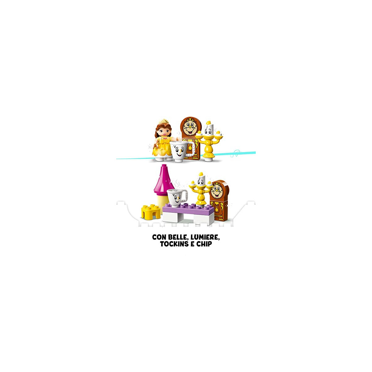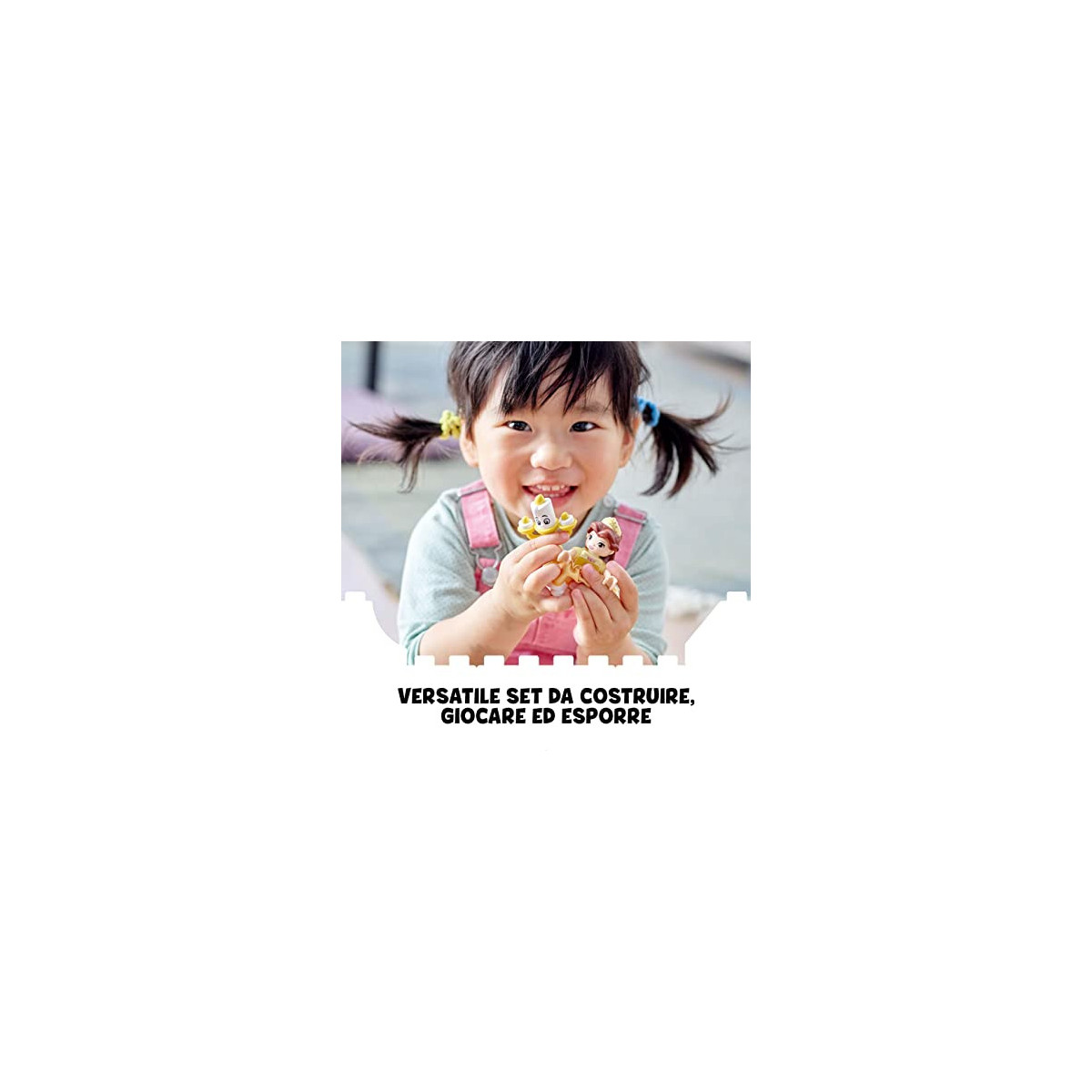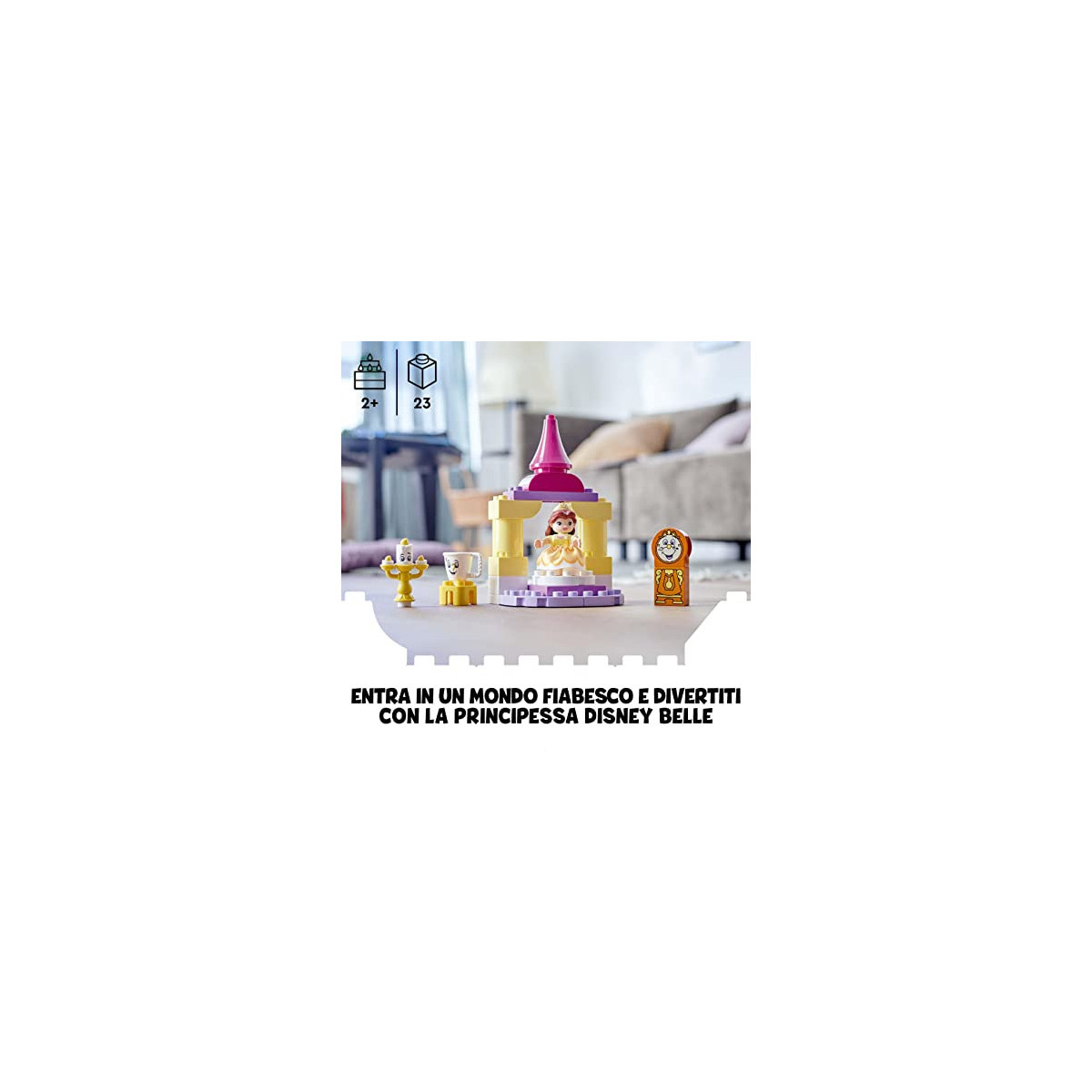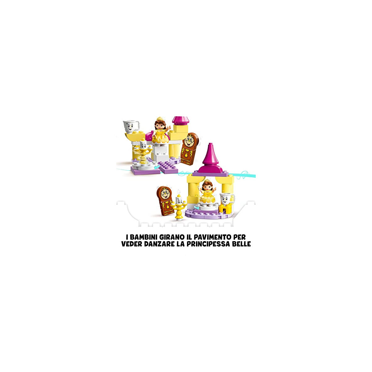 In questa costruzione giocattolo LEGO per bambini dai 2 anni in su, i piccoli diventano parte della magia Disney vestendo la principessa Belle con il suo abito in tessuto dorato e mettendola poi nella sala da ballo del castello. Potranno usare il dito per girare il pavimento e guardare Belle mentre balla con i suoi amici Disney Princess: Lumiere, Tockins e Chip. Questo giocattolo creativo adatto ai bambini più piccoli può anche essere riconfigurato per offrire infinite opportunità di gioco creativo e divertimento costruttivo.