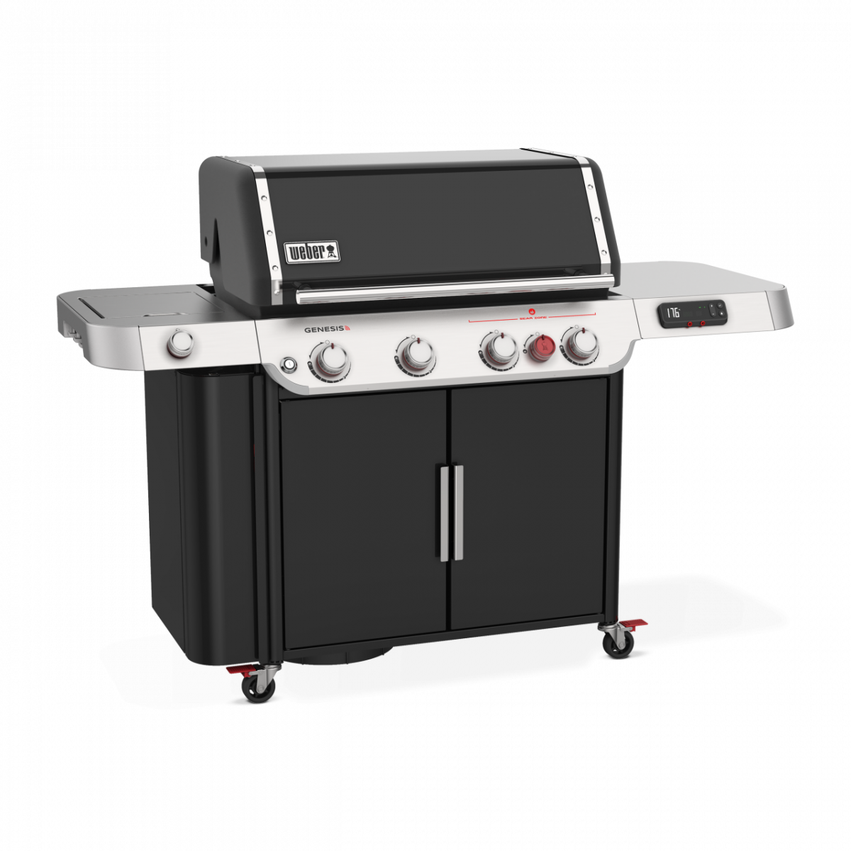 Design accativante e finiture premium. Ampi ripiani laterali, armadietto chiuso e scomparto laterale per riporre gli accessori barbecue.
