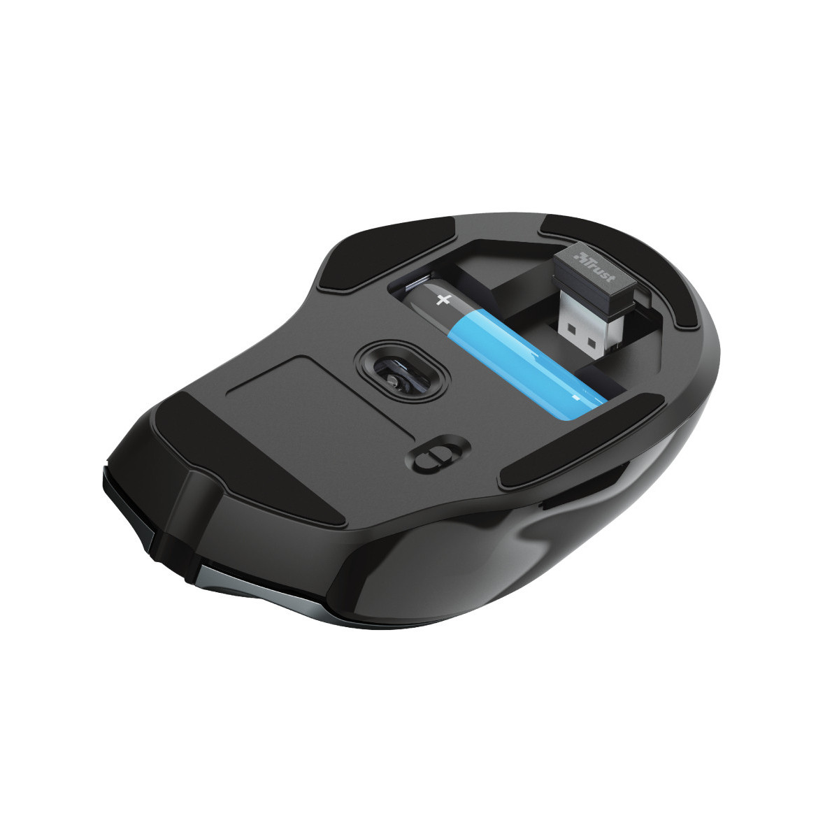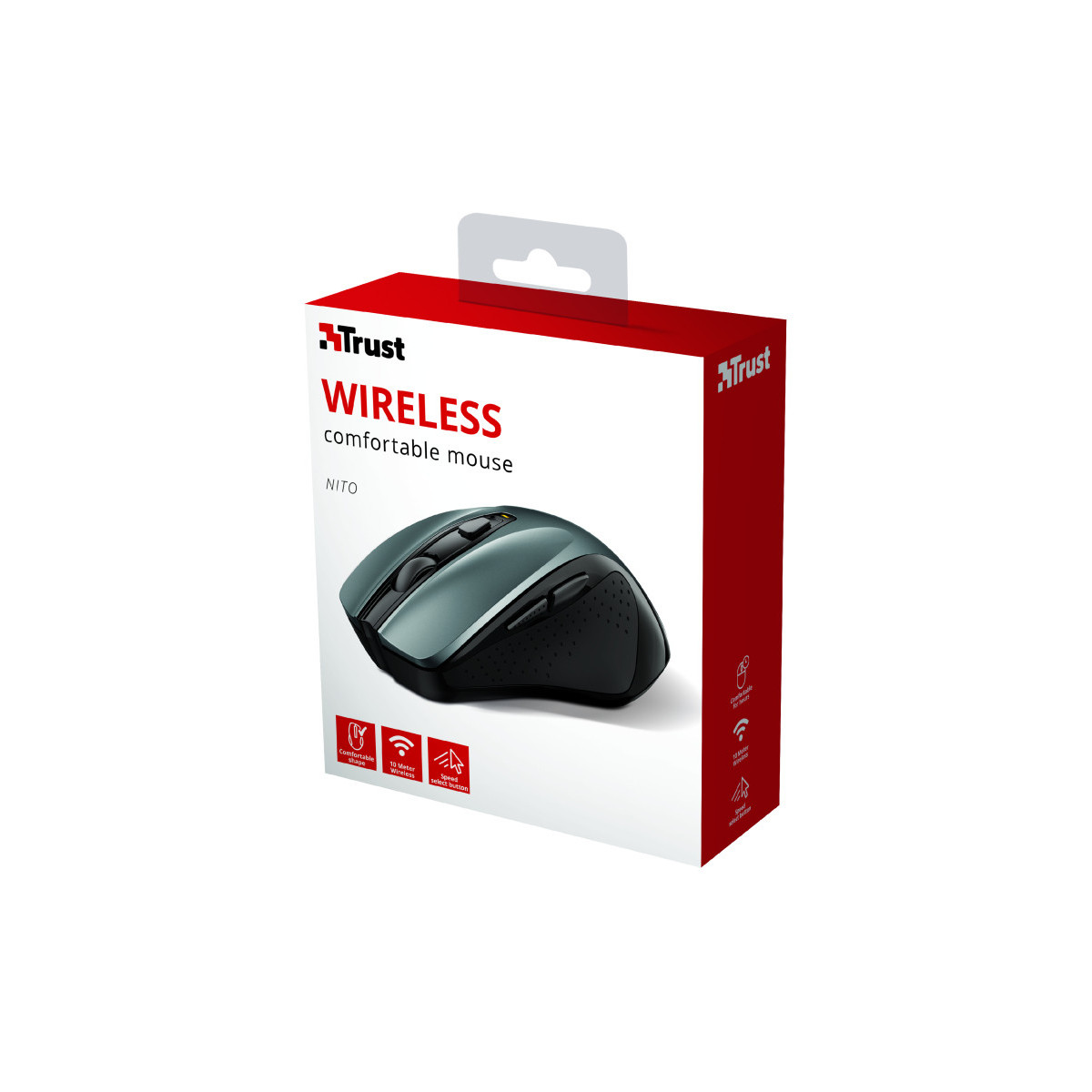 Trust Nito. Fattore di forma: Mano destra. Interfaccia dispositivo: RF Wireless, Risoluzione movimento: 2200 DPI, Tipo di pulsanti: Tasti premuti, Numero di tasti: 6, Tipo di scorimmento: Rotella. Alimentazione: Batterie. Colore del prodotto: Nero