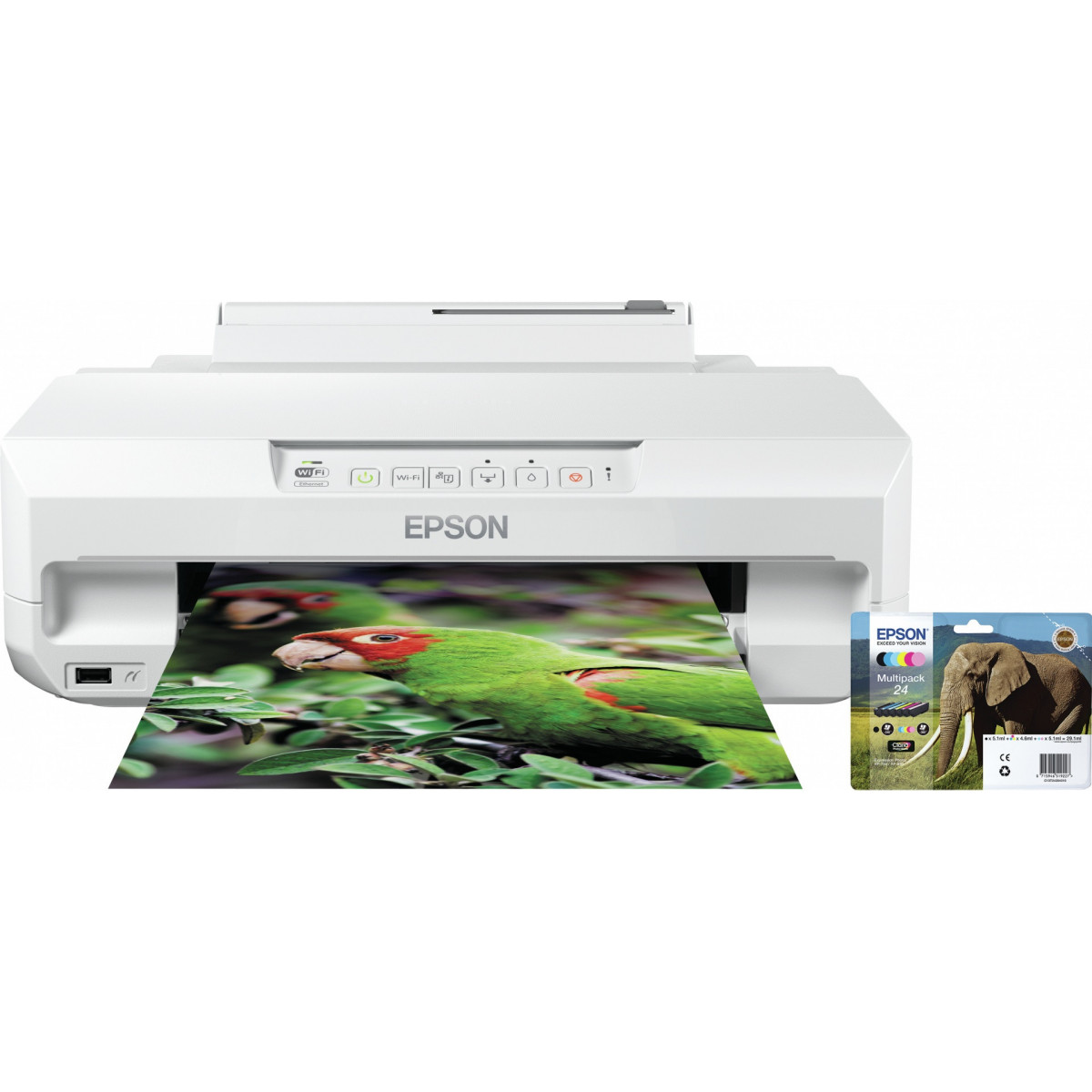 Epson Expression Photo XP-55. Tecnologia di stampa: Ad inchiostro, Risoluzione massima: 5760 x 1400 DPI. Dimensioni massime di stampa: A4 (210 x 297 mm). Stampa senza bordi, Stampa fronte/retro. Wi-Fi. Colore del prodotto: Bianco