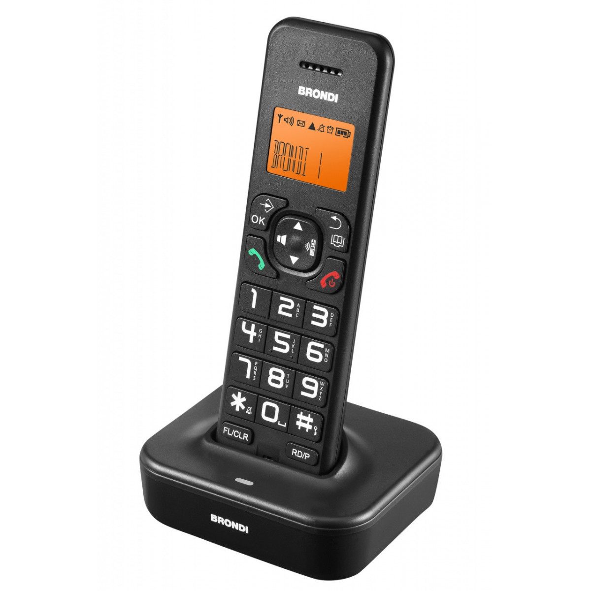 Brondi Bravo Star. Tipo: Telefono DECT, Tipo di apparecchio: Cornetta wireless. Telefono con vivavoce. Raggio d'azione interno: 50 m, Raggio d'azione esterno: 300 m. Capacità rubrica: 50 voci. Identificatore di chiamata. Colore del prodotto: Nero. Numero di cornette incluse: 1