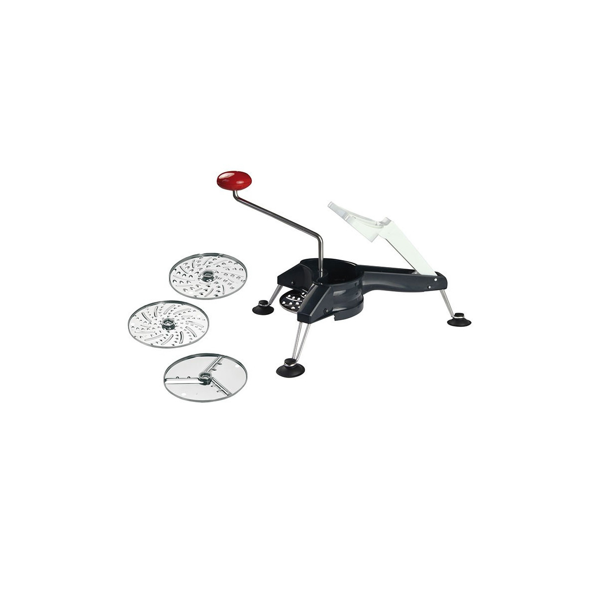 Caratteristiche tecniche : Affettaverdure Affetta-/Grattugia verdure Mouli con 3 piedini in gomma molto stabile con 3 dischi per julienne fine e grossolana e taglio a fette materiale: acciaio inox e ABS