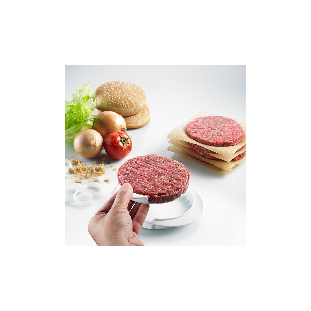 Caratteristiche tecniche : Stampo per hamburger Stampo per hamburger Ø 11 cm con pratico estrattore in materiale sintetico di alta qualità lavabile in lavastoviglie