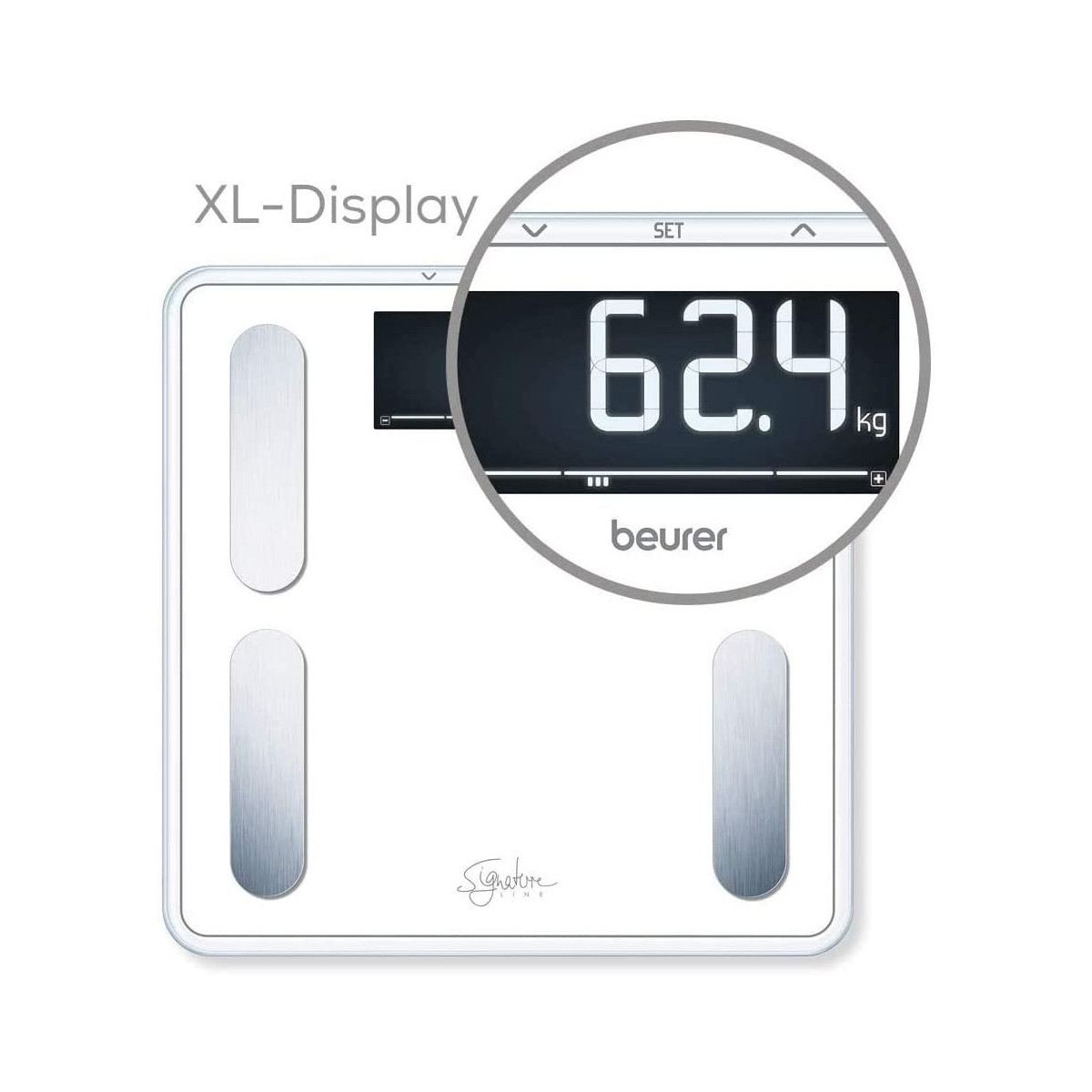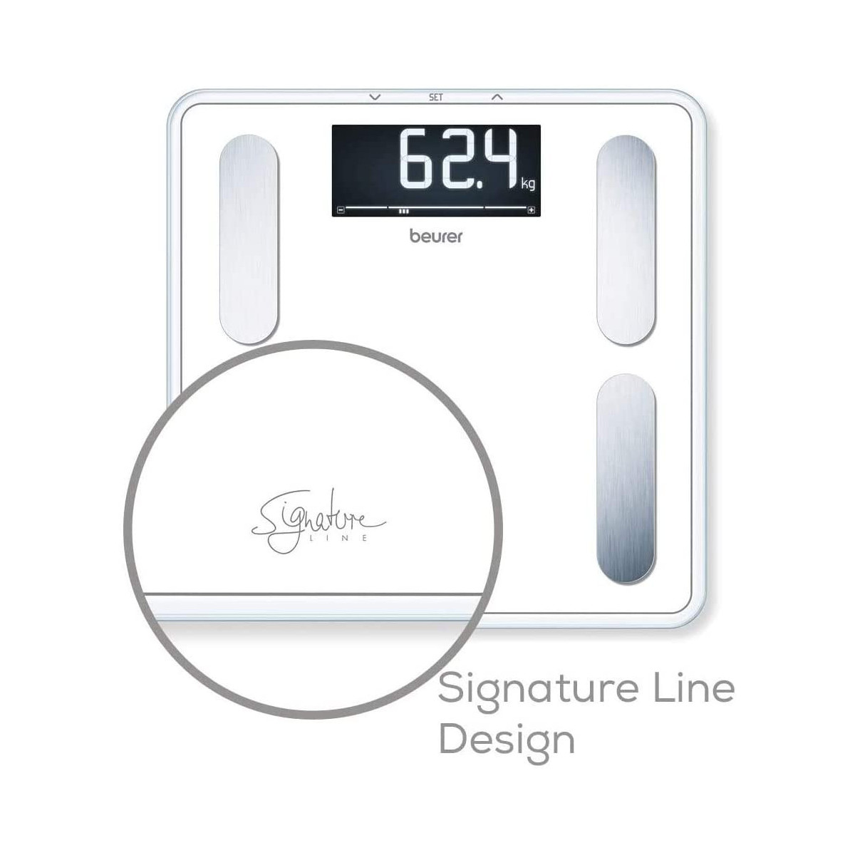Con la bilancia diagnostica BF 400 SignatureLine tenete sempre i vostri valori sotto controllo! La bilancia diagnostica nel moderno look SignatureLine con vetro di sicurezza super bianco non solo calcola tutti i valori misurati principali, ma li interpreta per voi.