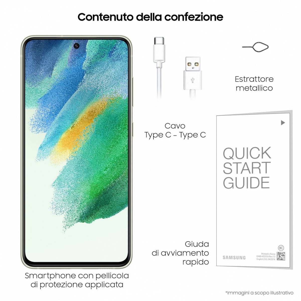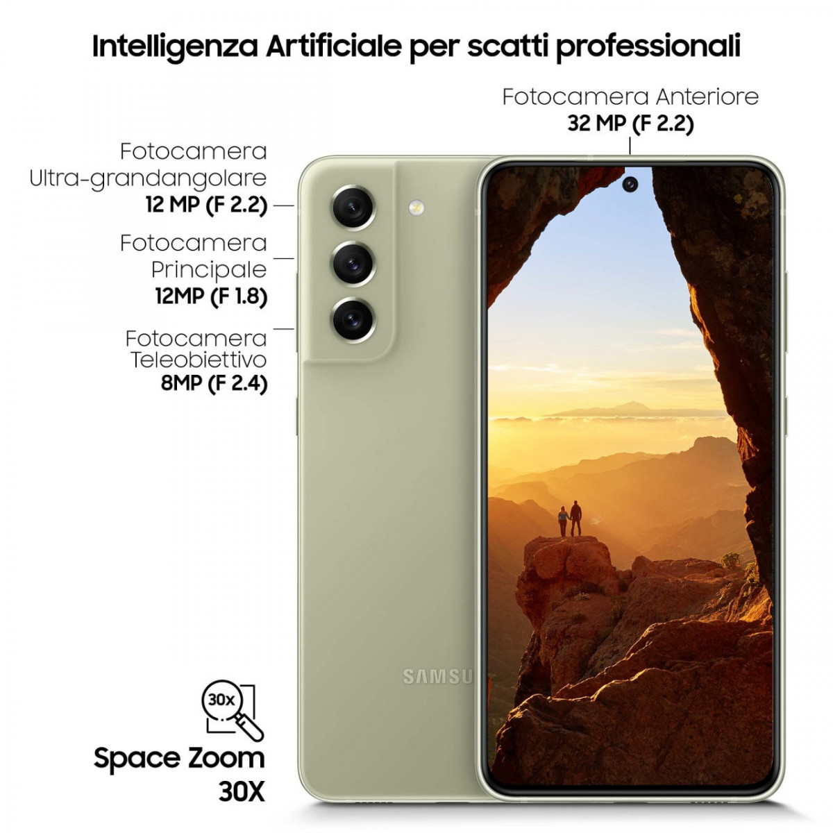 Samsung Galaxy S21 FE 5G Display 6.4" Dynamic AMOLED 2X, RAM 6 GB, 128 GB, 4.500mAh, Olive. Dimensioni schermo: 16,3 cm (6.4"), Risoluzione del display: 2340 x 1080 Pixel, Tipo di display: Dynamic AMOLED 2X. Frequenza del processore: 1,8 GHz, Famiglia processore: Qualcomm, Modello del processore: 888. Risoluzione fotocamera posteriore (numerico): 12 MP, Tipo di fotocamera posteriore: Tripla fotocamera. Capacità della scheda SIM: Doppia SIM. Sistema operativo incluso: Android 11. Capacità della batteria: 4500 mAh. Colore del prodotto: Oliva. Peso: 177 g