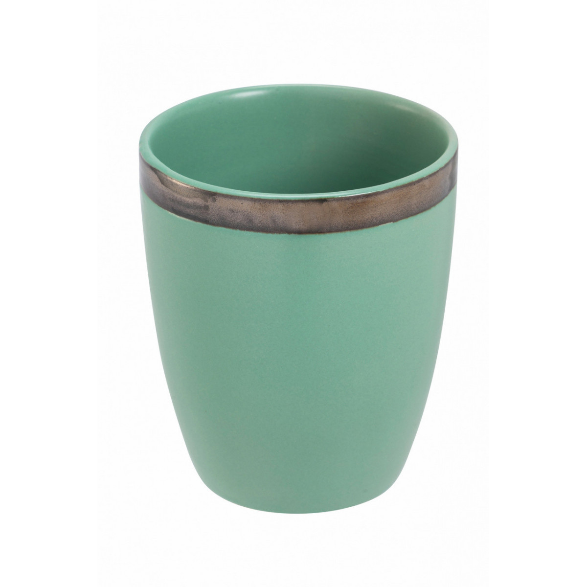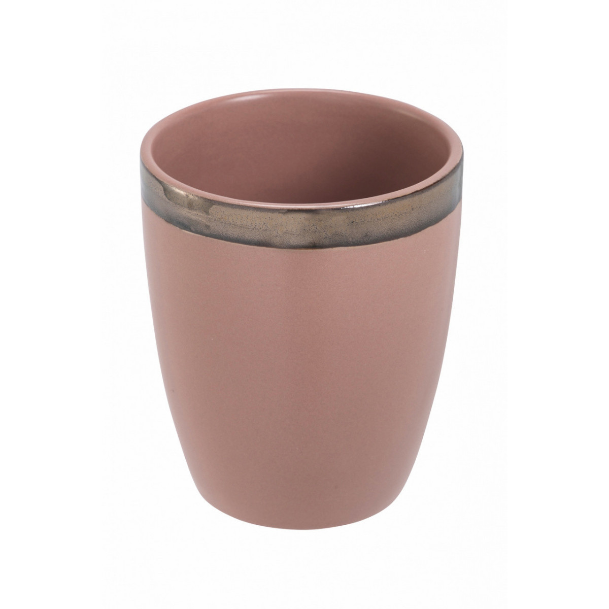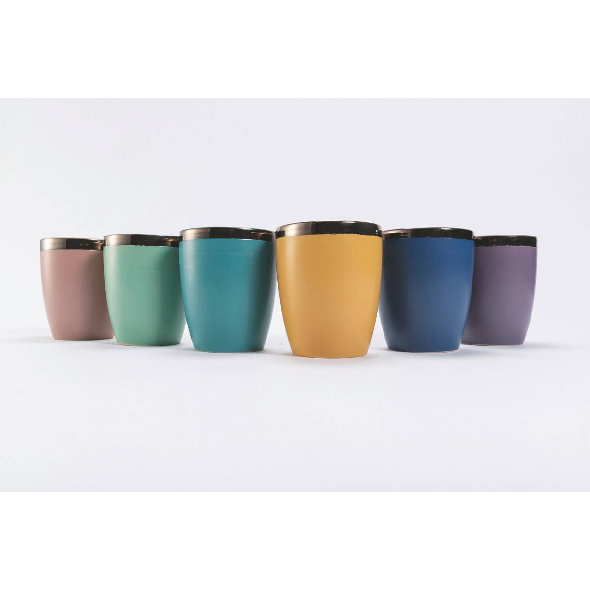 Un effetto pieno e opaco, che evoca le consistenze dell'argilla cruda, si chiude in un bordo copper, creando un accostamento elegante e suggestivo.