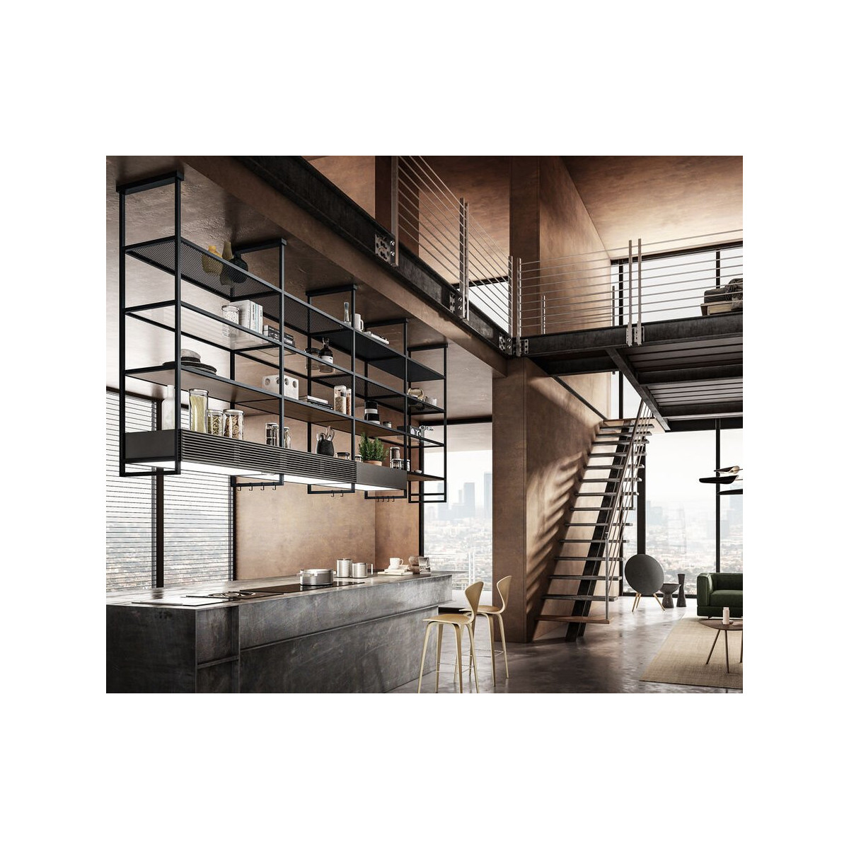 Open Suite Superior dona carattere all’ambiente attraverso una struttura modulare e personalizzabile, dallo stile unico e riconoscibile. Partendo da due configurazioni base da 80 o 160cm, è possibile realizzare la propria composizione aggiungendo moduli aspiranti, pannelli luminosi e un’ampia scelta di ripiani: vetro (chiaro o smoke), metallo, rete metallica e legno di noce oppure realizzare un ripiano in linea con lo stile della cucina avvalendosi della cornice disponibile come accessorio. Anche l’altezza della struttura è regolabile millimetricamente per consentire l’installazione su ogni soffitto.