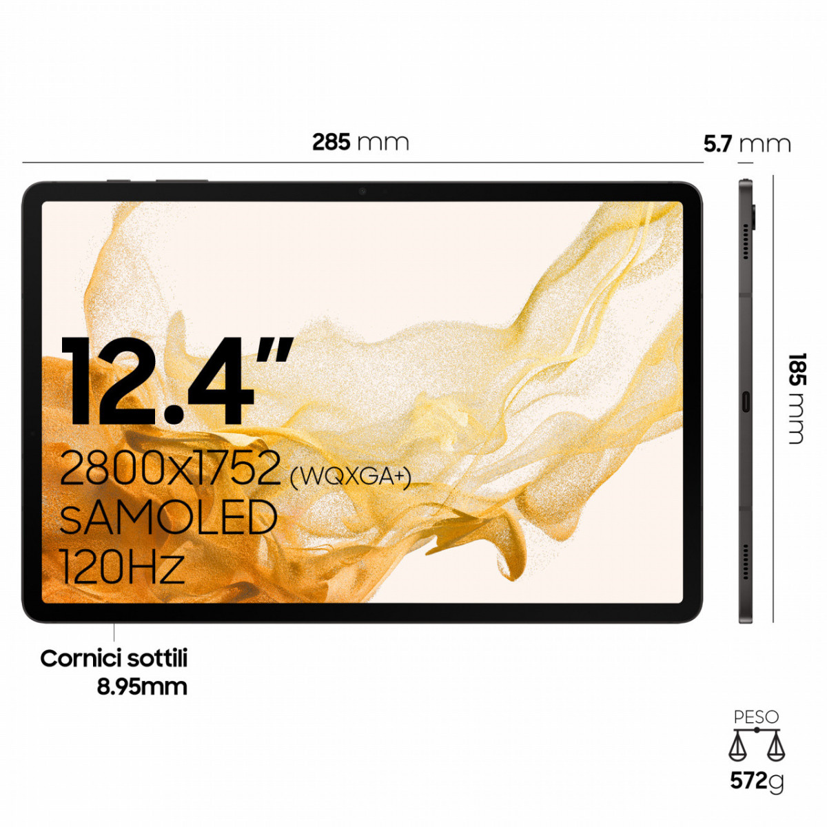 Samsung Galaxy Tab S8+ Galaxy Tab S8+ Tablet Android 12.4 Pollici 5G RAM 8 GB 256 GB Tablet Android 12 Graphite [Versione italiana] 2022. Dimensioni schermo: 31,5 cm (12.4"), Risoluzione del display: 2800 x 1752 Pixel, Tecnologia display: Super AMOLED. Capacità memoria interna: 256 GB. Famiglia processore: Qualcomm Snapdragon, Modello del processore: SM8450. RAM installata: 8 GB. Risoluzione fotocamera posteriore (numerico): 13 MP, Risoluzione fotocamera frontale (numerico): 12 MP. Wi-Fi standard: Wi-Fi 6 (802.11ax). Assistenza funzione GPS (A-GPS). Lettore di schede integrato. Peso: 572 g. Sistema operativo incluso: Android 12. Colore del prodotto: Grafite
