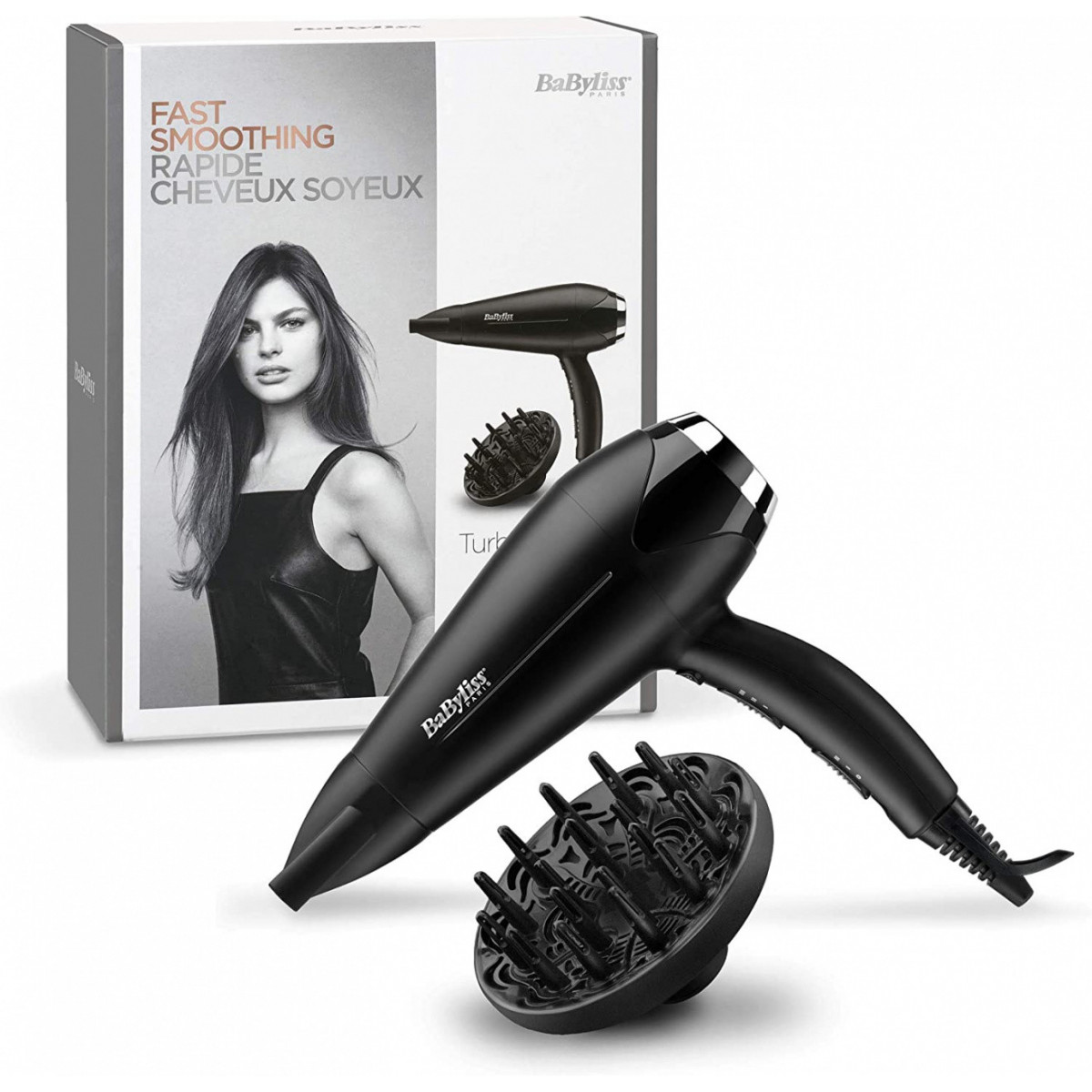 BaByliss D572DE Turbo Smooth 2200 - Asciugacapelli, 3 Temperature, Funzione Ionica Anti-Crespo, Diffusore, Concentratore Sottile