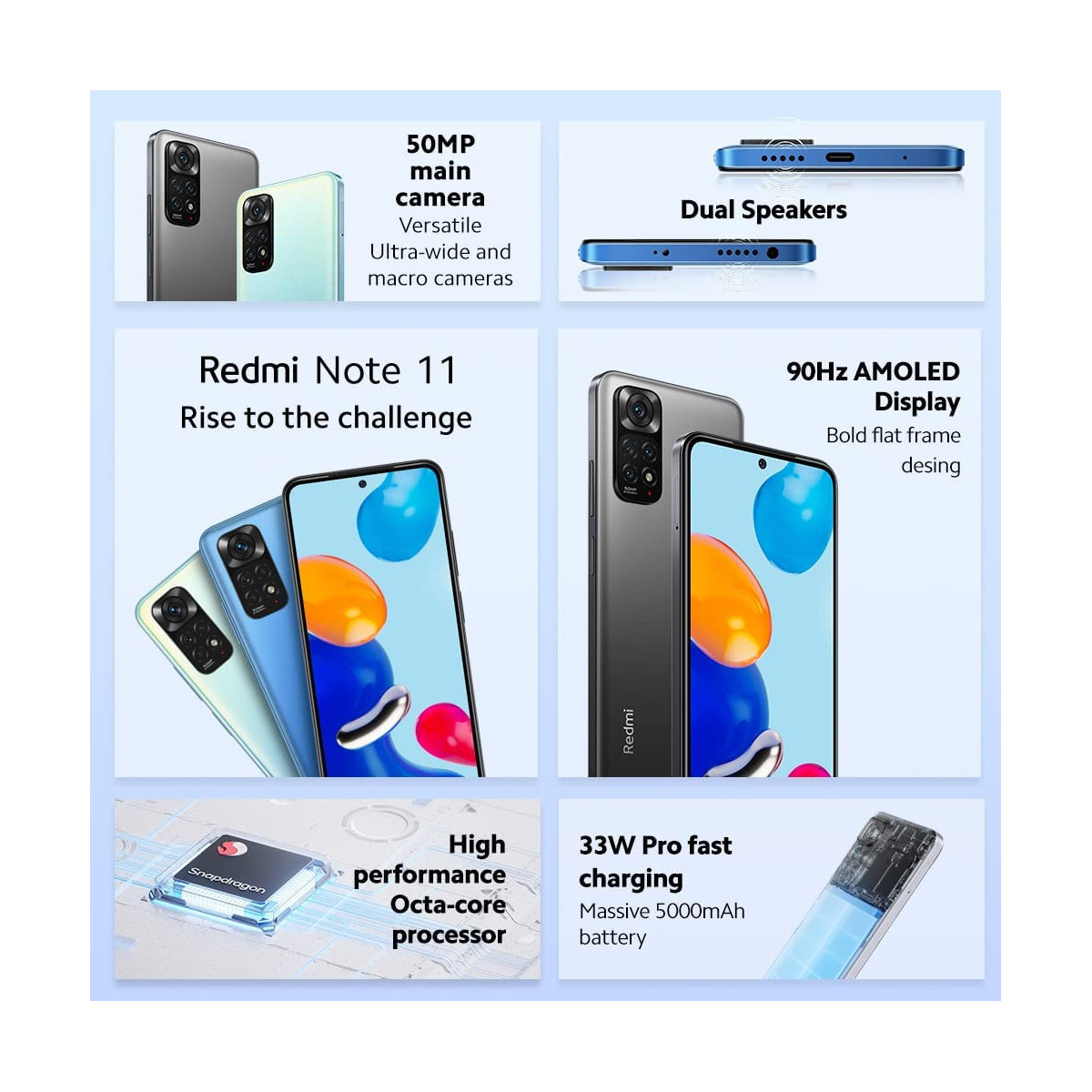 - Con due altoparlanti lineari posizionati nella parte superiore e inferiore, Redmi Note 11 offre un suono stereo coinvolgente per giocare e guardare video