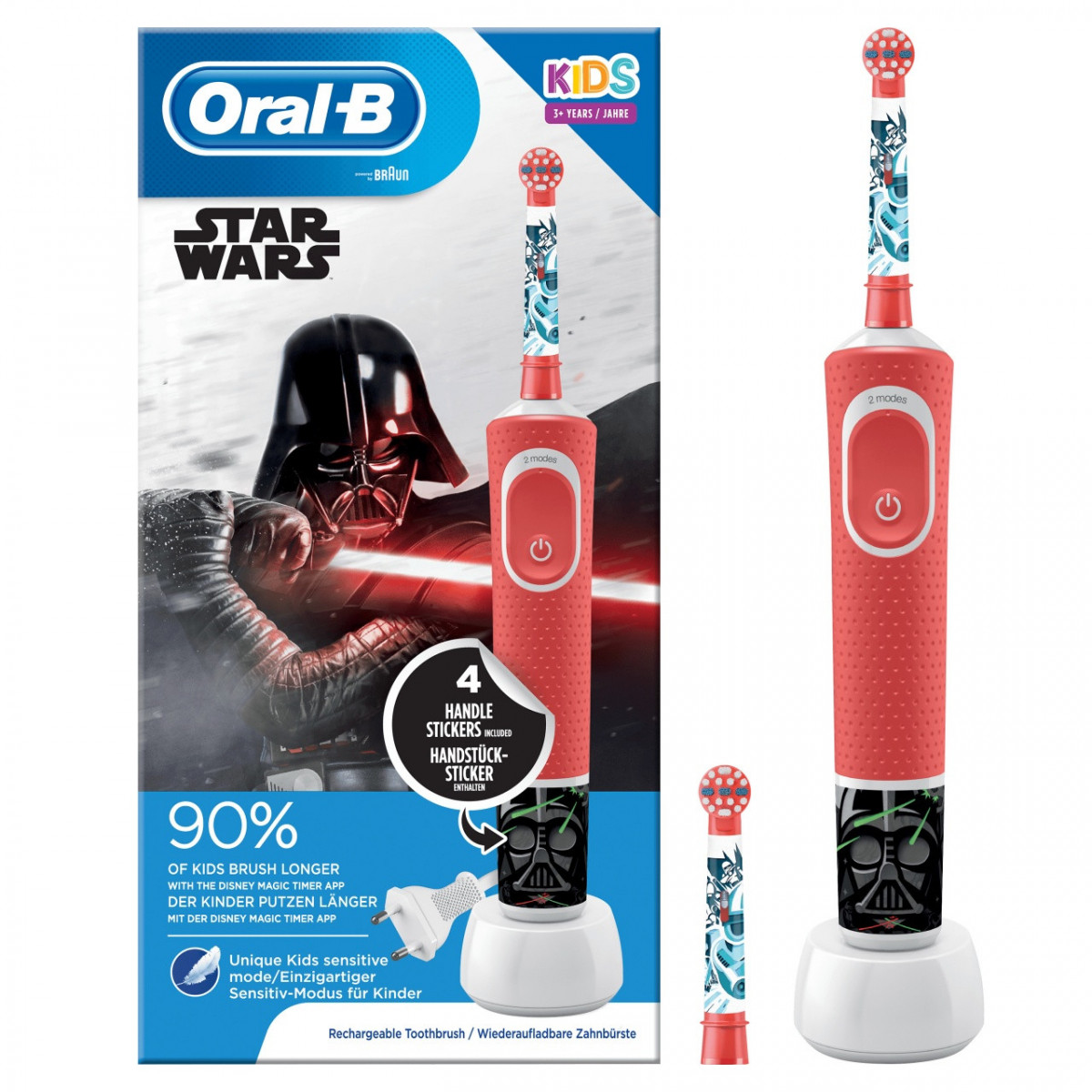 Spazzolino Elettrico Ricaricabile Oral-B Kids per bambini dai 3 anni in su. Offre la pulizia efficace e delicata di uno spazzolino Oral-B e il divertimento di Star Wars. Con l'esclusiva modalità delicata studiata per i bambini, questo spazzolino pulisce delicatamente denti e gengive dei più piccoli. Rimuove fino al 100% in più di placca rispetto ad uno spazzolino manuale tradizionale. Sono inclusi 4 adesivi a tema Star Wars per personalizzare lo spazzolino. Il 90% dei bambini spazzola i denti più a lungo con l'App Disney Magic Timer raggiungendo i 2 minuti di spazzolamento, come raccomandato dai dentisti.