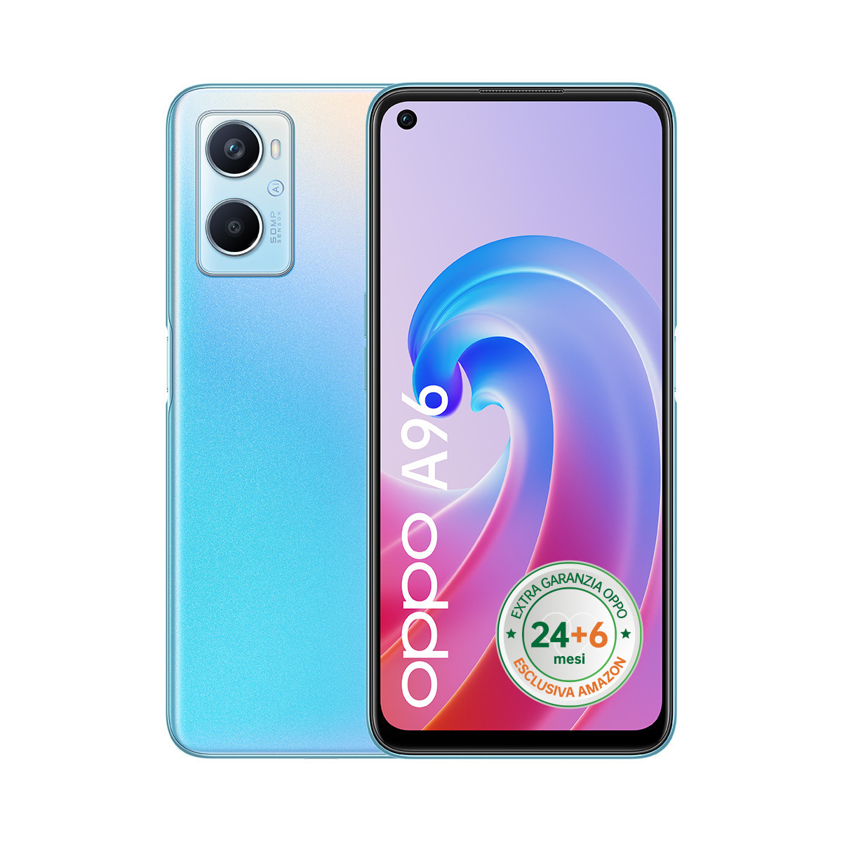 OPPO A96 Smartphone, NFC, Fotocamera principale da 50 Mp+AI e frontale da 16Mp, Display 6.59” 90HZ, 5000mAh, RAM 8GB+128GB espand. (1TB), [Extra Garanzia 24+6 Mesi Versione Italiana] Sunset Blue. Dimensioni schermo: 16,7 cm (6.59"), Risoluzione del display: 2412 x 1080 Pixel, Tipo di display: LCD. Famiglia processore: Qualcomm Snapdragon, Modello del processore: 680. Capacità della RAM: 8 GB, Tipo di RAM: LPDDR4, Capacità memoria interna: 128 GB. Risoluzione fotocamera posteriore (numerico): 50 MP, Tipo di fotocamera posteriore: Doppia fotocamera. Capacità della scheda SIM: Doppia SIM. Sistema operativo incluso: Android 11. Capacità della batteria: 5000 mAh. Colore del prodotto: Blu. Peso: 190,9 g
