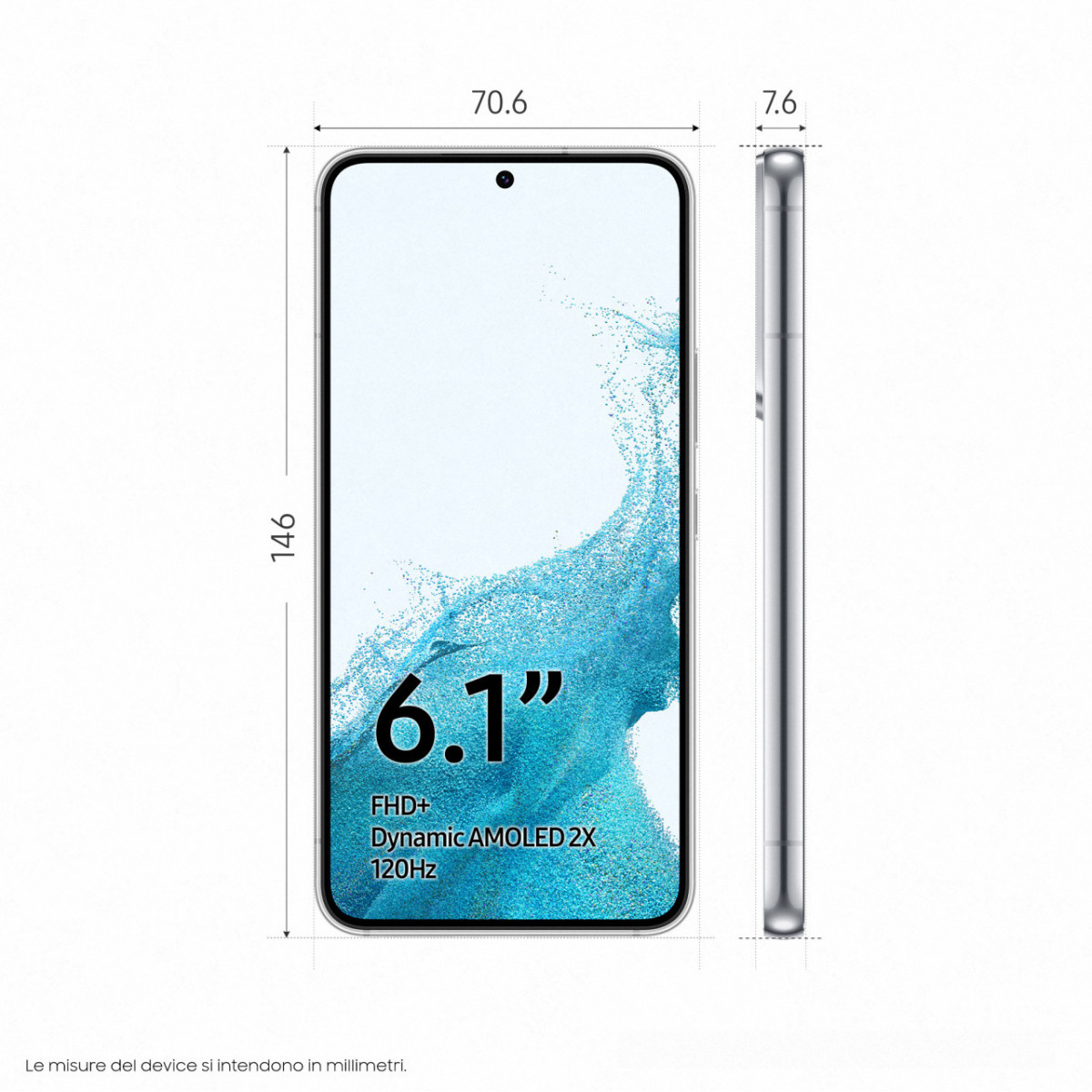 1_Misurato diagonalmente, la dimensione schermo di Galaxy S22 è di 6.1” considerando l’intero rettangolo e di 5.9” esclusi gli angoli stondati; l’area visualizzabile effettiva è inferiore per la presenza degli angoli stondati e del foro della fotocamera.