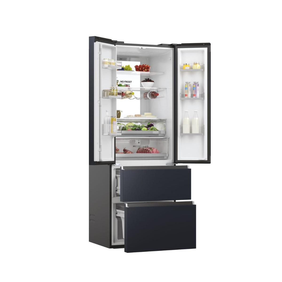 Haier FD 70 Serie 7 HFW7720ENMB. Posizionamento dell'apparecchio: Libera installazione, Colore del prodotto: Nero, Design del prodotto: Porta francese. Capacità netta totale: 477 L, Classe climatica: SN, Classe emissione rumore: C. Capacità netta frigorifero: 337 L. Capacità netta congelatore: 140 L, Posizione del congelatore: Posto in basso, Capacità di congelamento: 14 kg/24h. Classe efficienza energetica: E, Consumo energetico annuo: 302 kWh, Scala di efficienza energetica: Da A a G