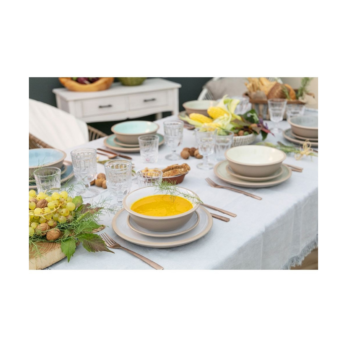 Il servizio Bistrot con le sue tinte pastello e la robustezza di quei materiali che alla vista e al tatto ci ricordano la terra, ci prende per mano e ci porta intorno alla tavola di un casale circondato dalla pietra e dalle distese di grano che si abbronza al sole.