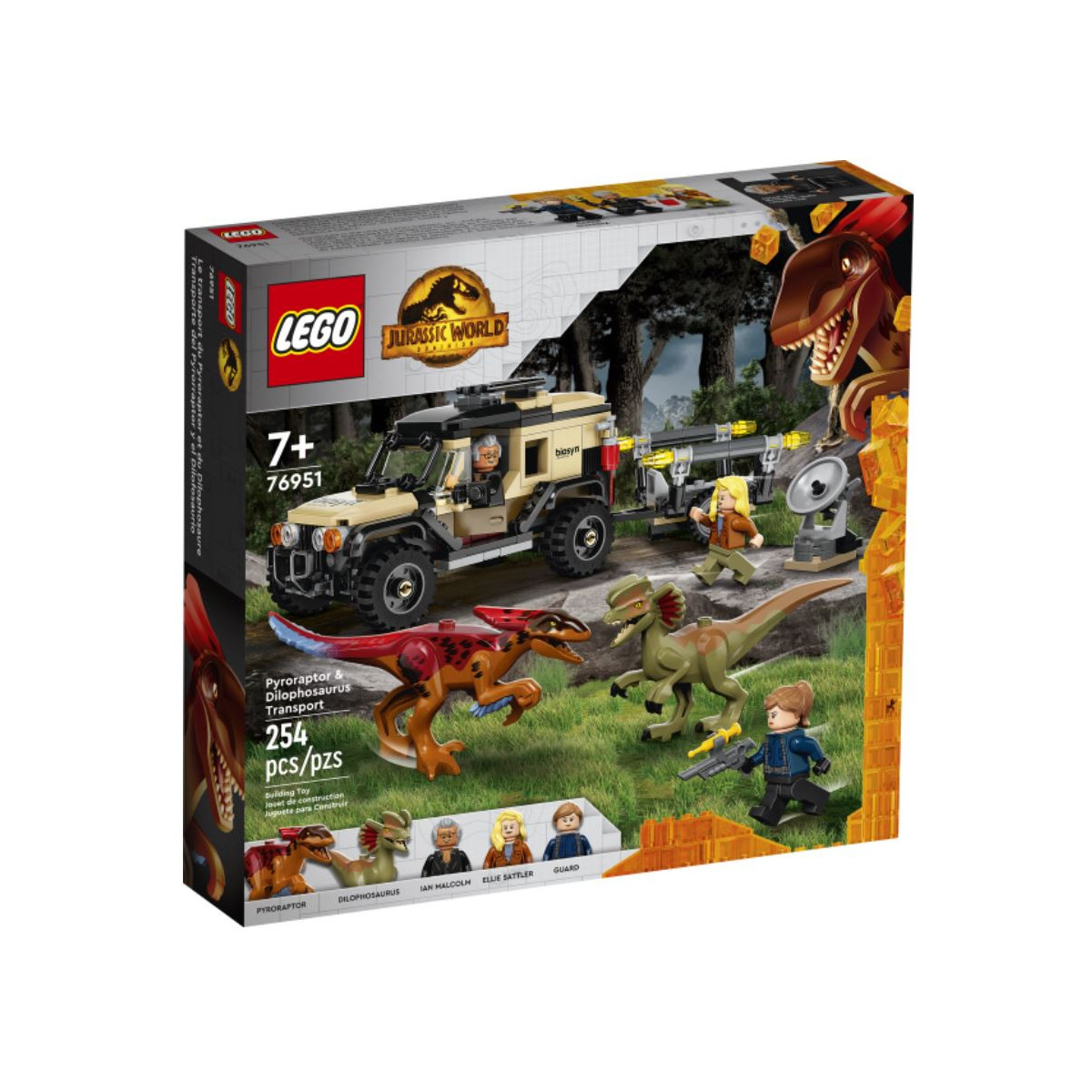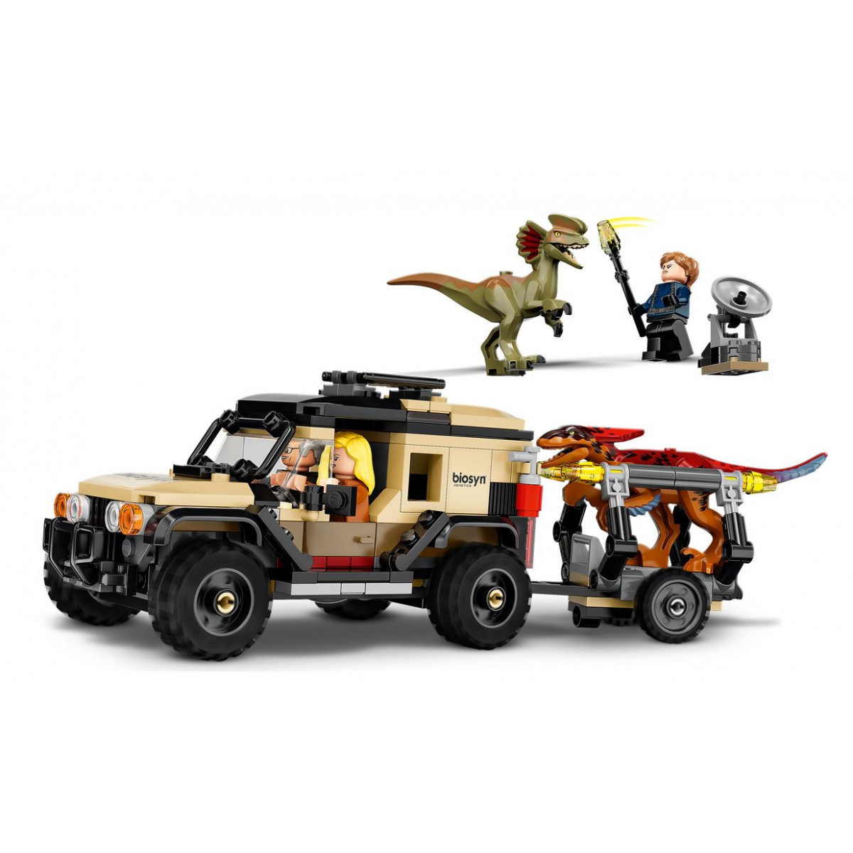 Vivi storie ricche d'azione con le 3 minifigure di Ian Malcolm, della dottoressa Ellie Sattler e della guardia con tranquillante, insieme ai dinosauri giocattolo Pyroraptor e Dilophosaurus. Parti alla ricerca dei due dinosauri con il fuoristrada laboratorio, traccia la loro posizione e tieniti pronto a catturarli con la trappola.