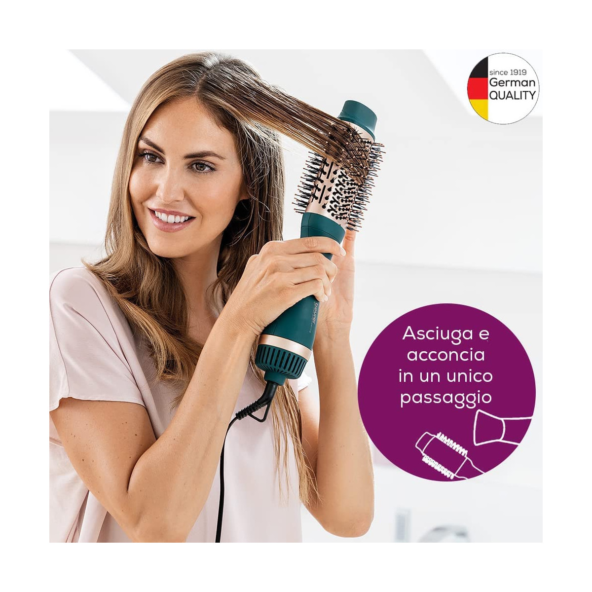 Per il massimo volume: con la spazzola potete asciugare e contemporaneamente acconciare i capelli. Il prezioso rivestimento in ceramica e cheratina garantisce la protezione necessaria durante l'acconciatura.