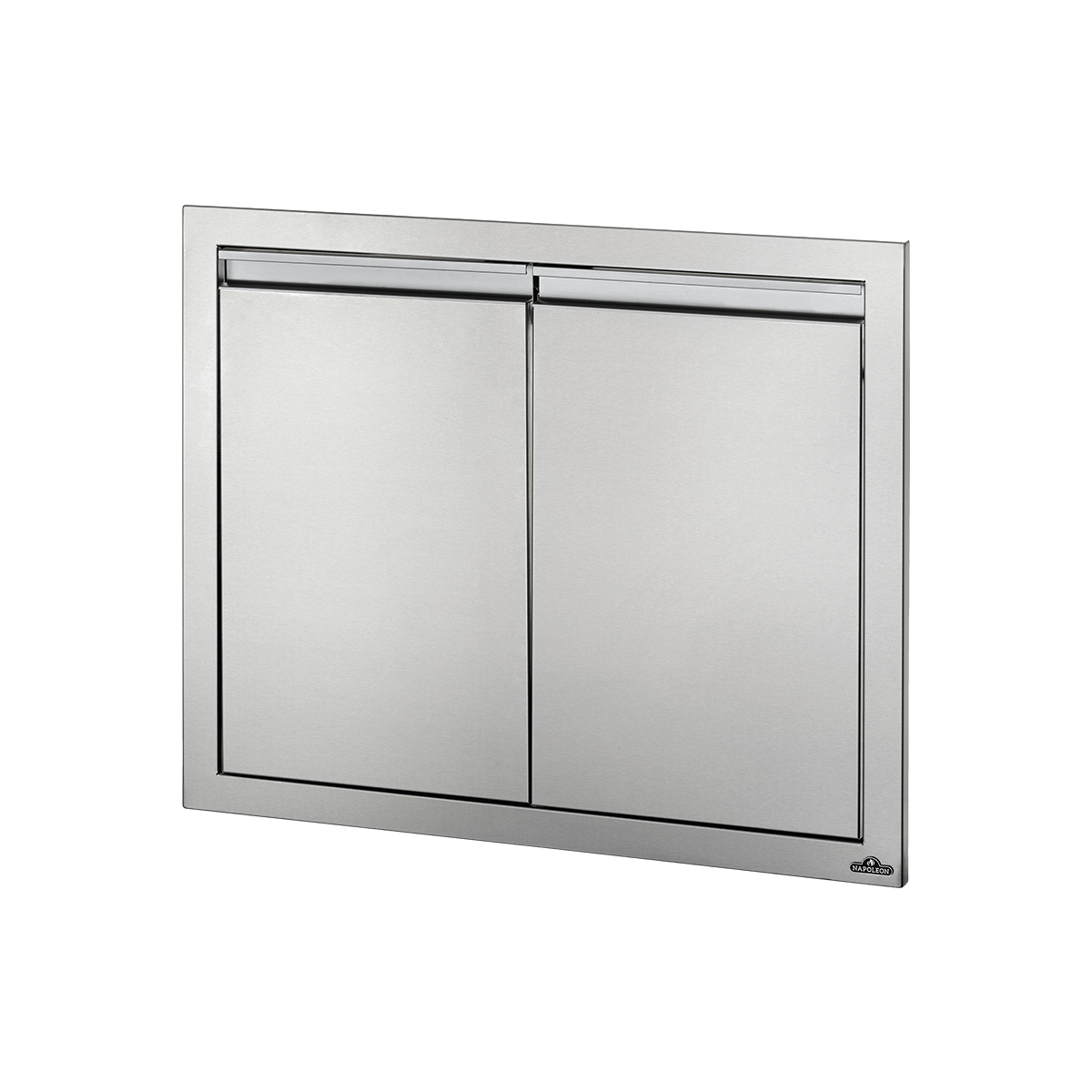 Elegante porta da incasso in robusto acciaio inossidabile. Le porte sono dotate di chiusura rallentata. Perfetto per riporre bombole del gas o altri utensili per barbecue più grandi (84,8 x 70,5 x 9,2 cm).