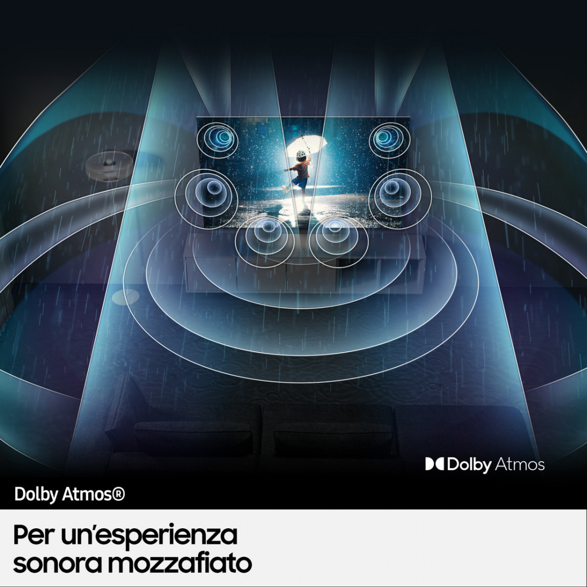 Al centro della scena: audio senza rivali grazie al suono tridimensionale diffuso dagli speciali altoparlanti integrati nel TV. (Dolby Atmos non è presente nel modello da 32”)