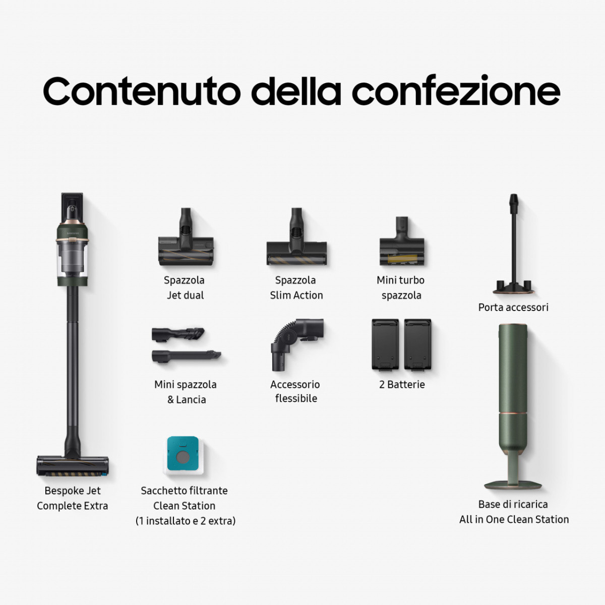 Samsung BESPOKE Jet complete extra, Scopa Elettrica Senza Filo Senza Sacchetto, Potenza 210 watt, woody green. Tipo di contenitore della polvere: Senza sacchetto, Colore del prodotto: Nero, Capacità del contenitore: 0,5 L. Tipo di pulizia: Secco, Metodo di separazione dello sporco: Ciclonico, Superficie di pulizia: Pavimento, Tappeto, Superfici rigide, Gradini, Tappezzeria. Alimentazione: Batteria, Massima potenza in entrata: 580 W, Potenza motore: 210 W. Larghezza imballo: 408 mm, Profondità imballo: 493 mm, Altezza imballo: 921 mm. Larghezza: 250 mm, Profondità: 210 mm, Altezza: 1000 mm