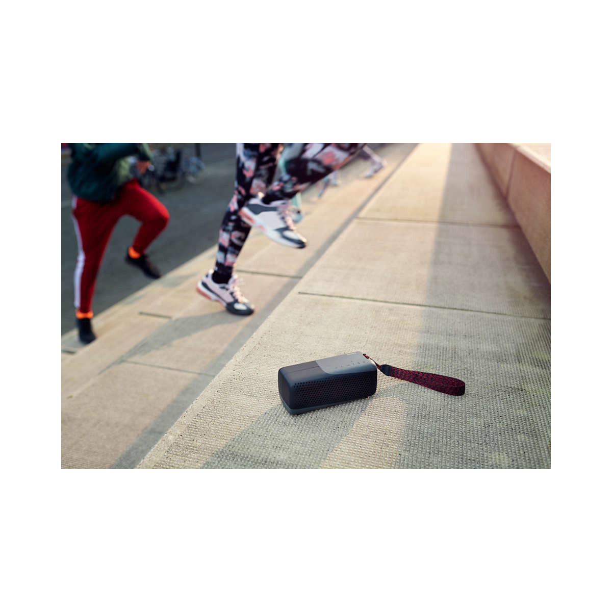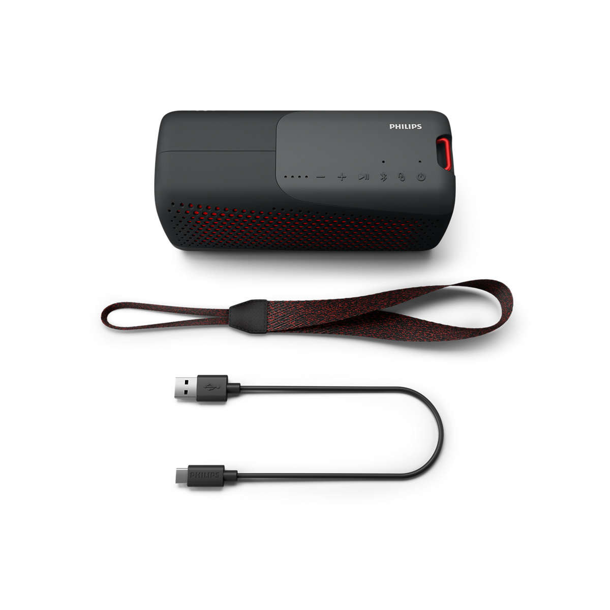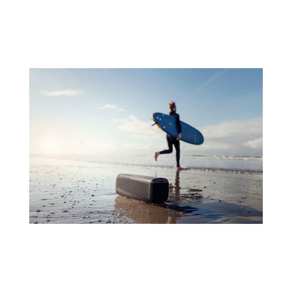 Dalla pista alla spiaggia fino alla piscina: la classificazione IP67 ti consente di portare ovunque questo altoparlante. Il cordino rimovibile è l'ideale per trasportarlo facilmente, mentre con la portata Bluetooth fino a 20 m non perdi mai il ritmo. Anche se il tuo telefono si trova molto distante dall'altoparlante.