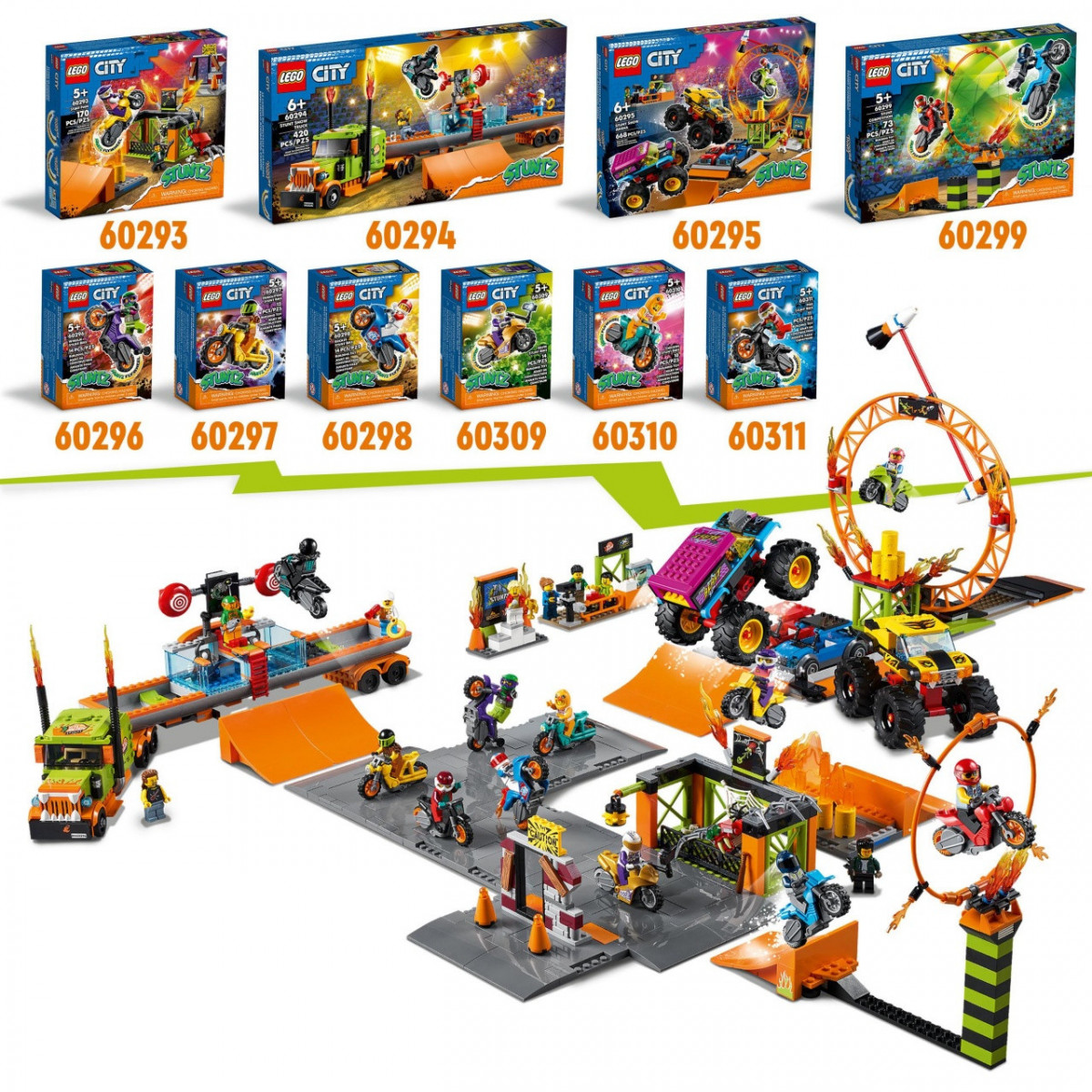 Il set LEGO Stunt Park (60293) fa parte della fantastica sotto-serie Stuntz di LEGO City e include una moto giocattolo con meccanismo a spinta con cui cimentarsi in acrobazie mozzafiato. I bambini possono lanciare la moto attraverso un'eccitante serie di ostacoli, che possono disporre come preferiscono: magari posizionando la gabbia col ragno gigante tra le due rampe!