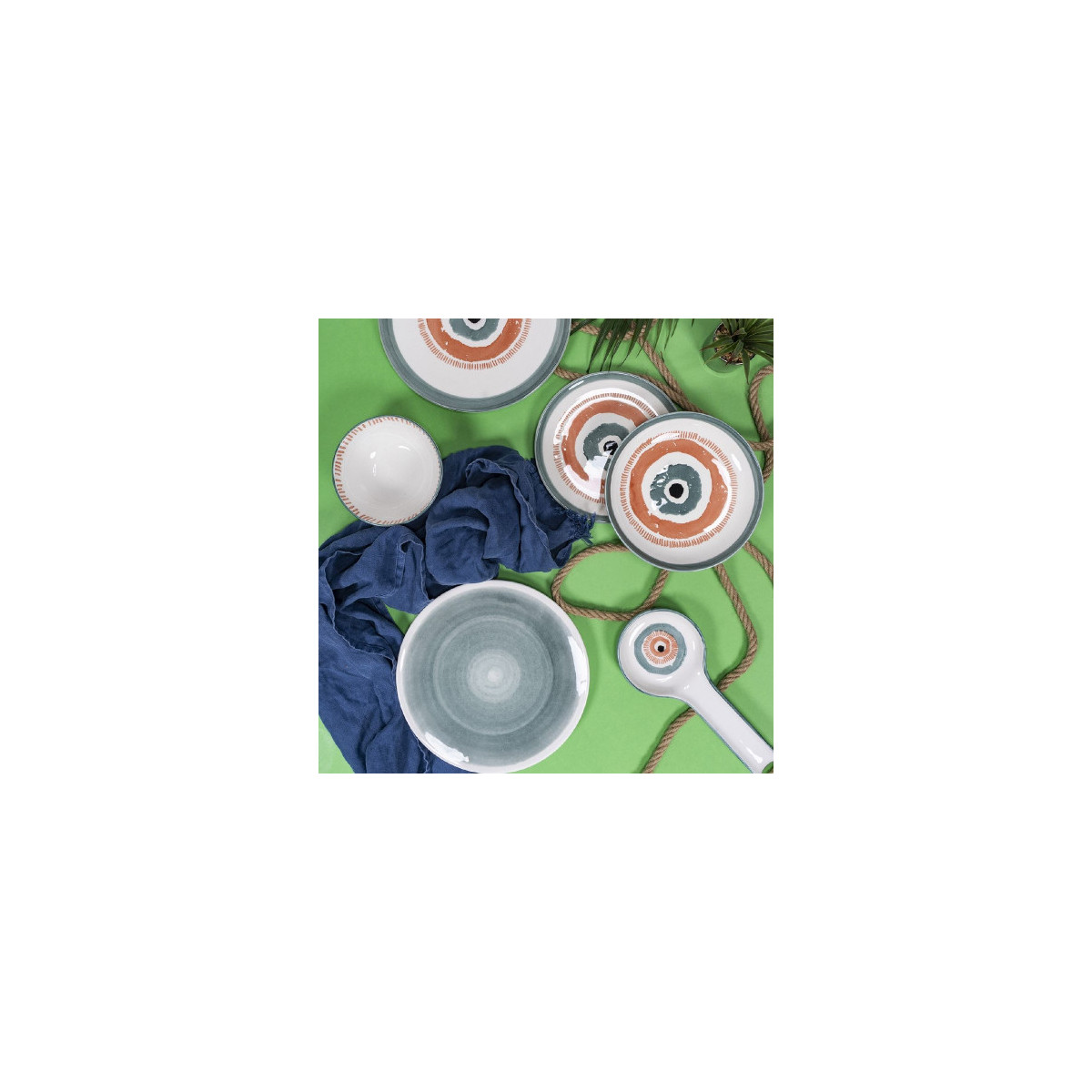 Lo stile coastal ha mille sfumature e declinazioni e la collezione Occhio Marino Arancio si propone di esaltare le tonalità di un tramonto in riva al mare. I decori di questa linea arricchiscono le superfici in dolomite dei complementi, creando sulla mise en place un effetto magnetico. Le cromie si alternano nei toni dell azzurro, e del bianco del mare e dell arancione confluendo in decori concentrici che creano un effetto armonioso ed accattivante. La collezione Occhio Marino Arancio sa di tramonto, sa di calore e sa di stile firmato Villa D Este.