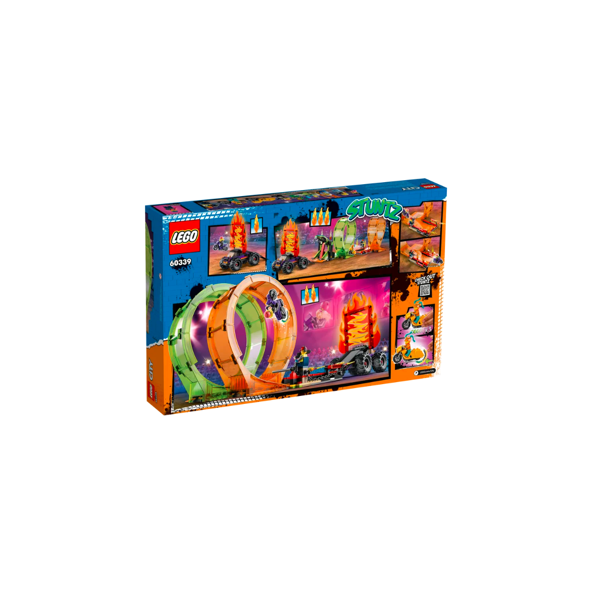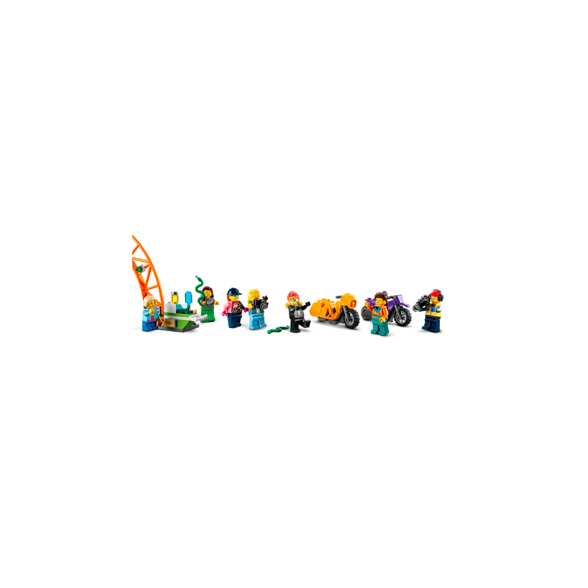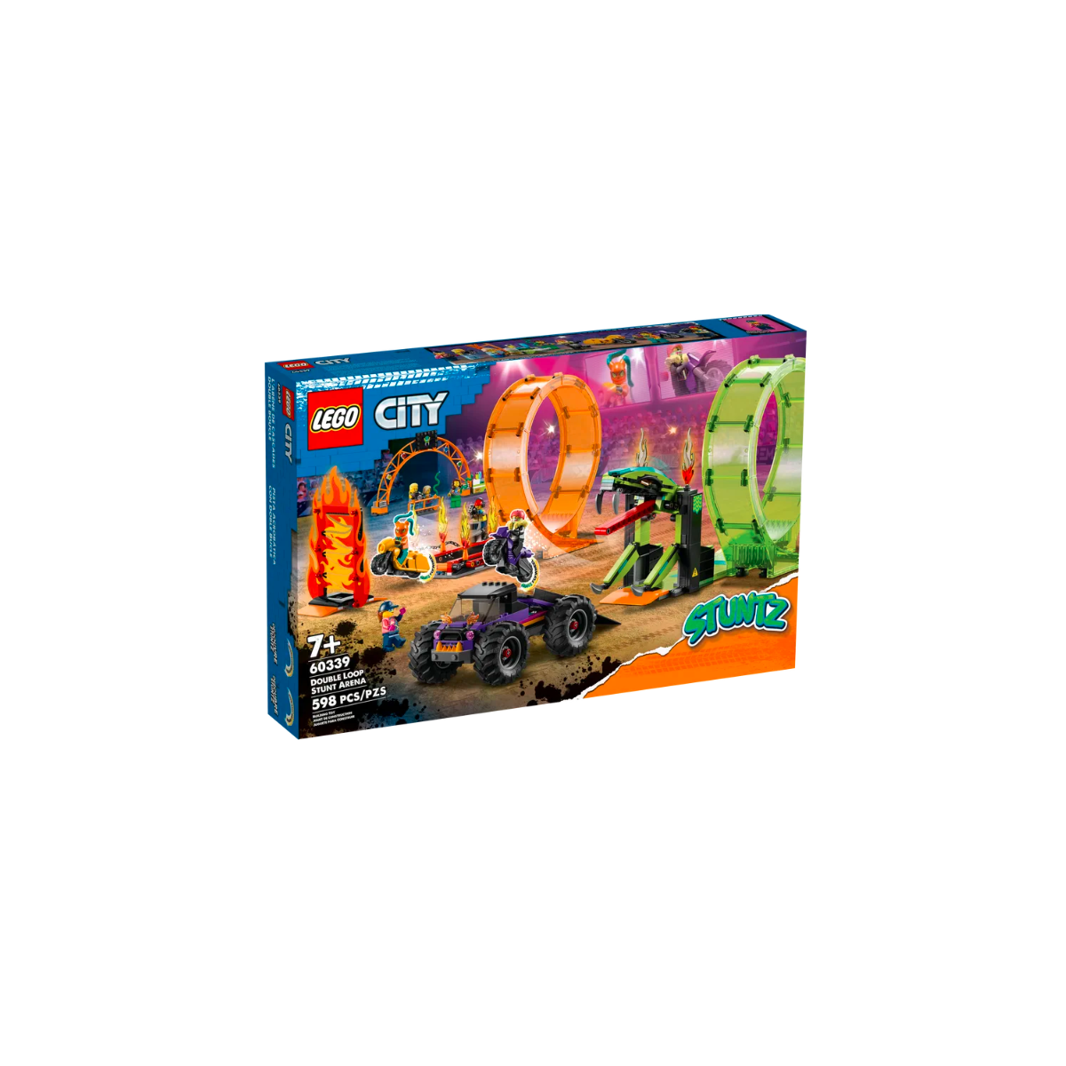 Porta lo show in città con il dinamico set LEGO City Stuntz Arena delle Acrobazie (60339), ricco di fantastici oggetti di scena e attrezzature. I bambini dai 7 anni in su possono creare tante acrobazie con le 2 moto giocattolo “carica e vai” di colore arancione e viola, un monster truck con rampa, un'entrata ad arco, un giro della morte, un minaccioso serpente con morsa a scatto e un cerchio di fuoco; oltre a tanti fantastici accessori come un chiosco, uno stand per gli spettatori con il palloncino a forma di serpente, un ghiacciolo, una bibita e una videocamera. Basta aggiungere le 7 minifigure LEGO, tra cui 2 originali motociclisti acrobatici, per creare tante avventure di fantasia piene di salti spericolati!
