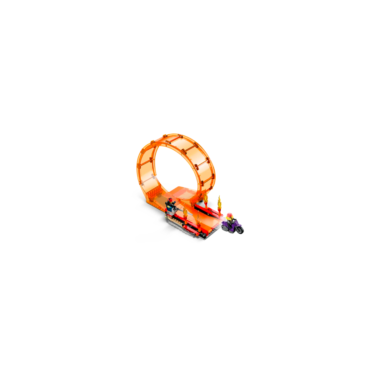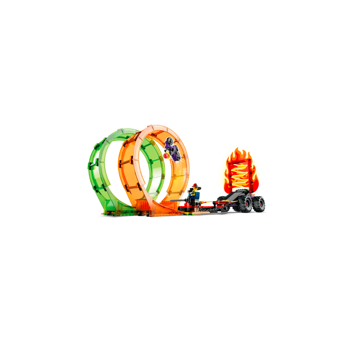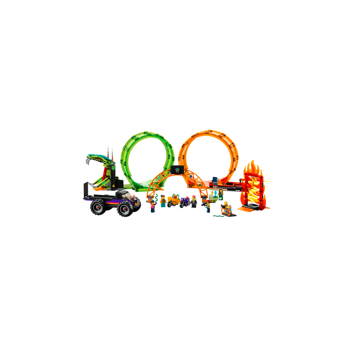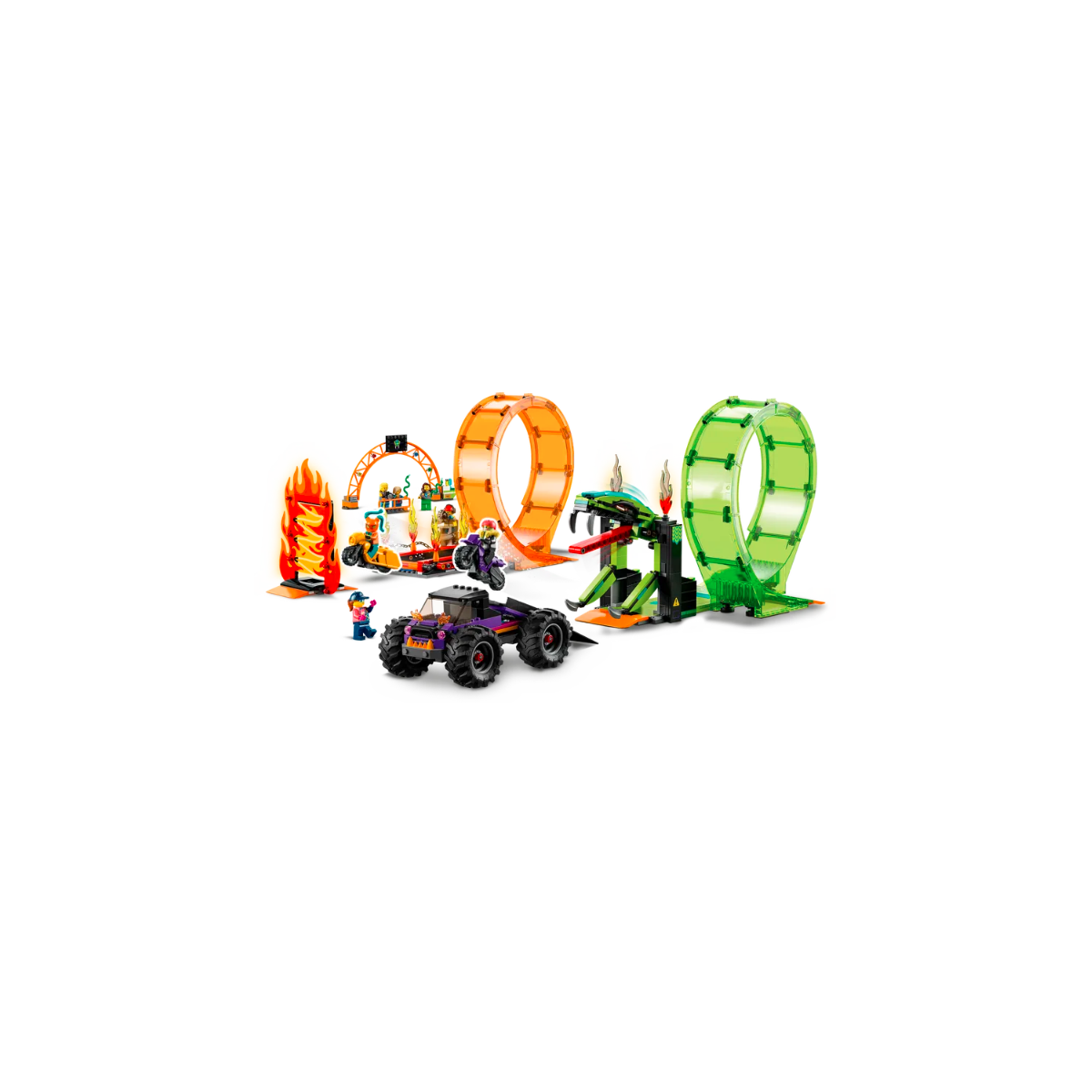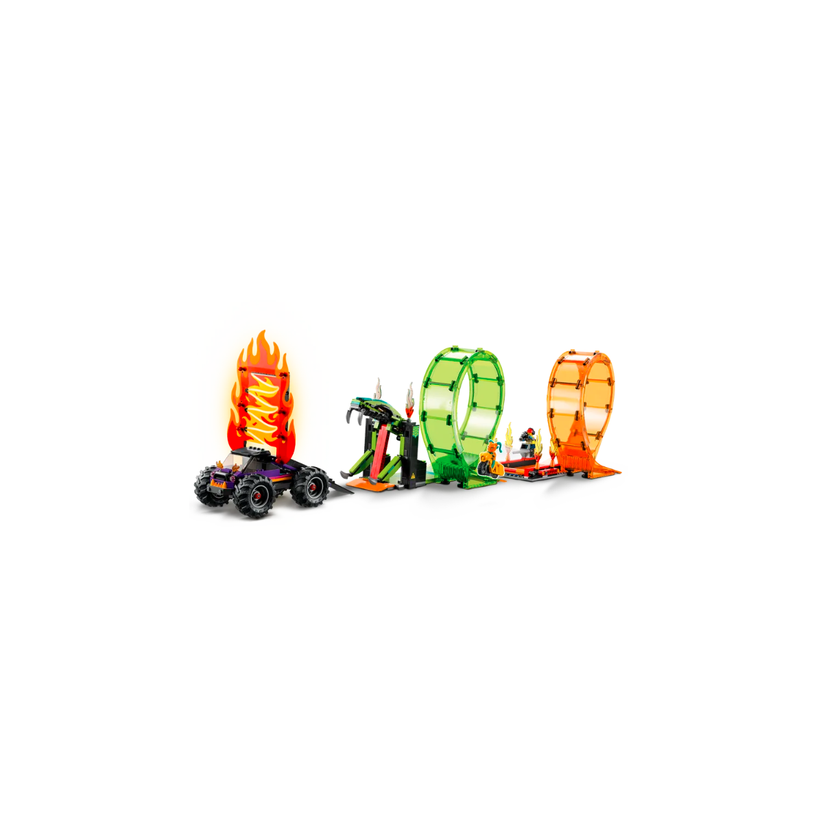 Vivi l'azione da brivido con l'Arena delle Acrobazie LEGO City Stuntz. Accendi la moto giocattolo con funzione “carica e vai”, vola sulla rampa di lancio del monster truck e passa attraverso le fiamme, fai un giro della morte e schiva il morso del serpente con una bella impennata! Poi sfida di nuovo la gravità per un'uscita perfetta dal cerchio di fuoco, mentre il cameraman filma l'azione con la sua videocamera a bordo rampa. Questo set è dotato di istruzioni per la costruzione facili da seguire, così i bambini possono provare l’emozione di realizzare i propri giocattoli LEGO da soli, per una divertente esperienza di costruzione.