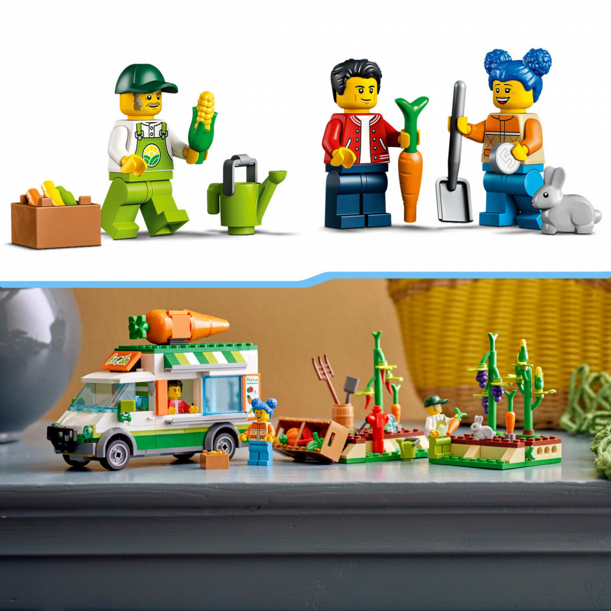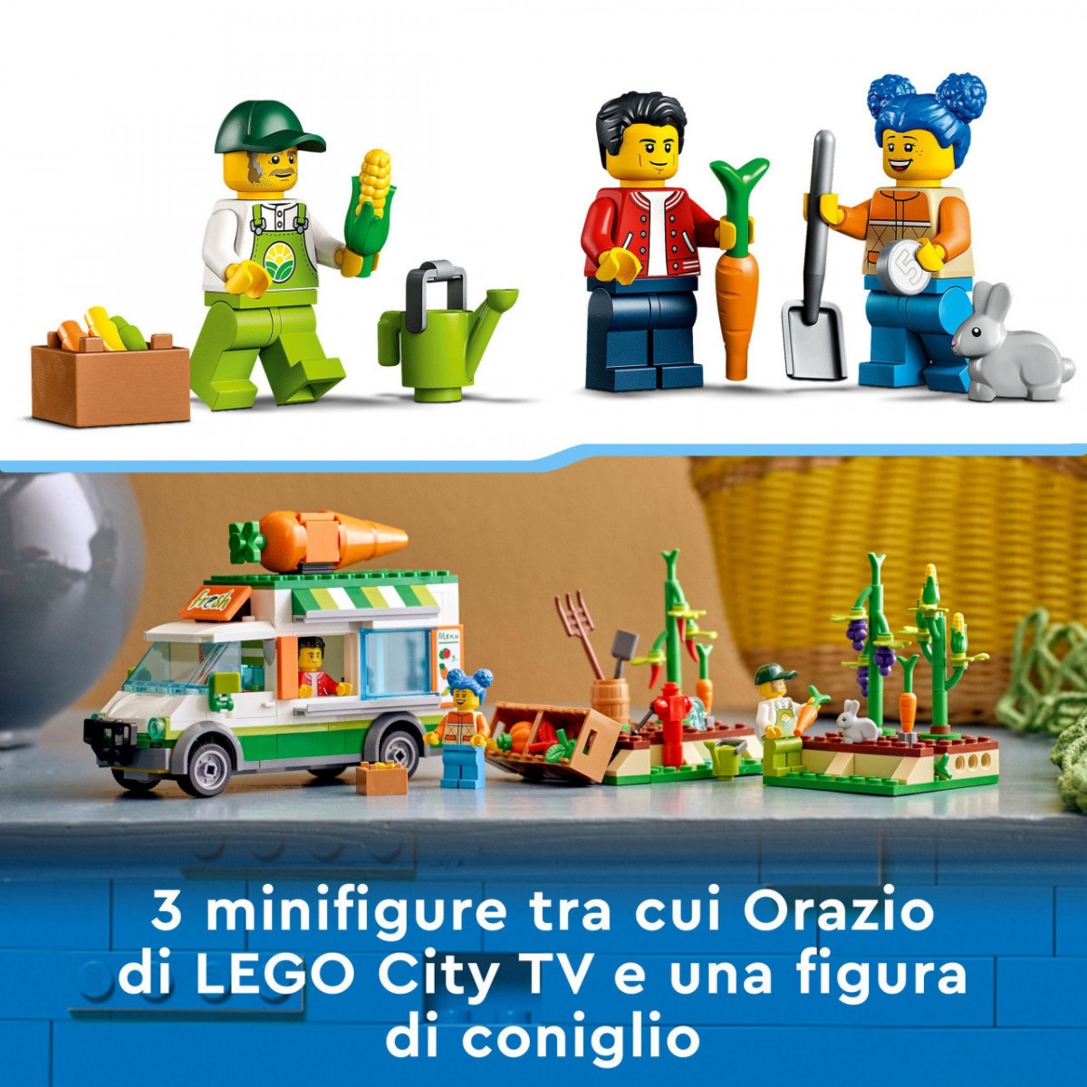 I bambini dai 5 anni in su si divertiranno ad allestire il camion giocattolo con i prodotti agricoli. Un furgone ricco di caratteristiche e fantastiche funzioni, come lo sportello per servire i clienti e le portiere apribili. Il set include anche un piccolo orto giocattolo con carote che compaiono e scompaiono e diversi prodotti da vendere nel mercatino della frutta mobile. Tanti accessori come un annaffiatoio, una pala, un forcone per il fieno e una botte, che ispirano il gioco di ruolo e la fantasia, più 3 minifigure LEGO e un coniglio.