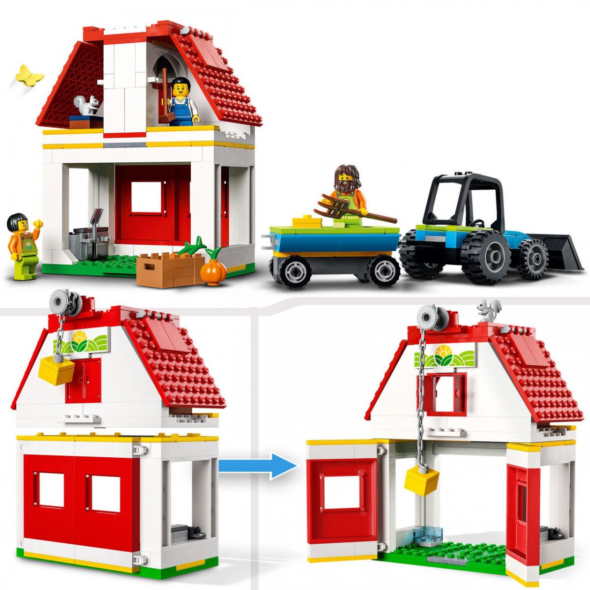 Questo set di costruzioni è dotato di una stalla con tetto apribile e argano funzionante, un trattore giocattolo con rimorchio e una serra, oltre alle figure di scoiattolo, pecora, agnello, maiale e mucca giocattolo in versione adulta e baby. Dai da mangiare ai simpatici animali della fattoria, pulisci i loro bisogni e lavali con il tubo per annaffiare mentre coltivi la verdura nella serra. Prenditi cura della pecora e tosa la pelliccia rimovibile come un vero contadino!